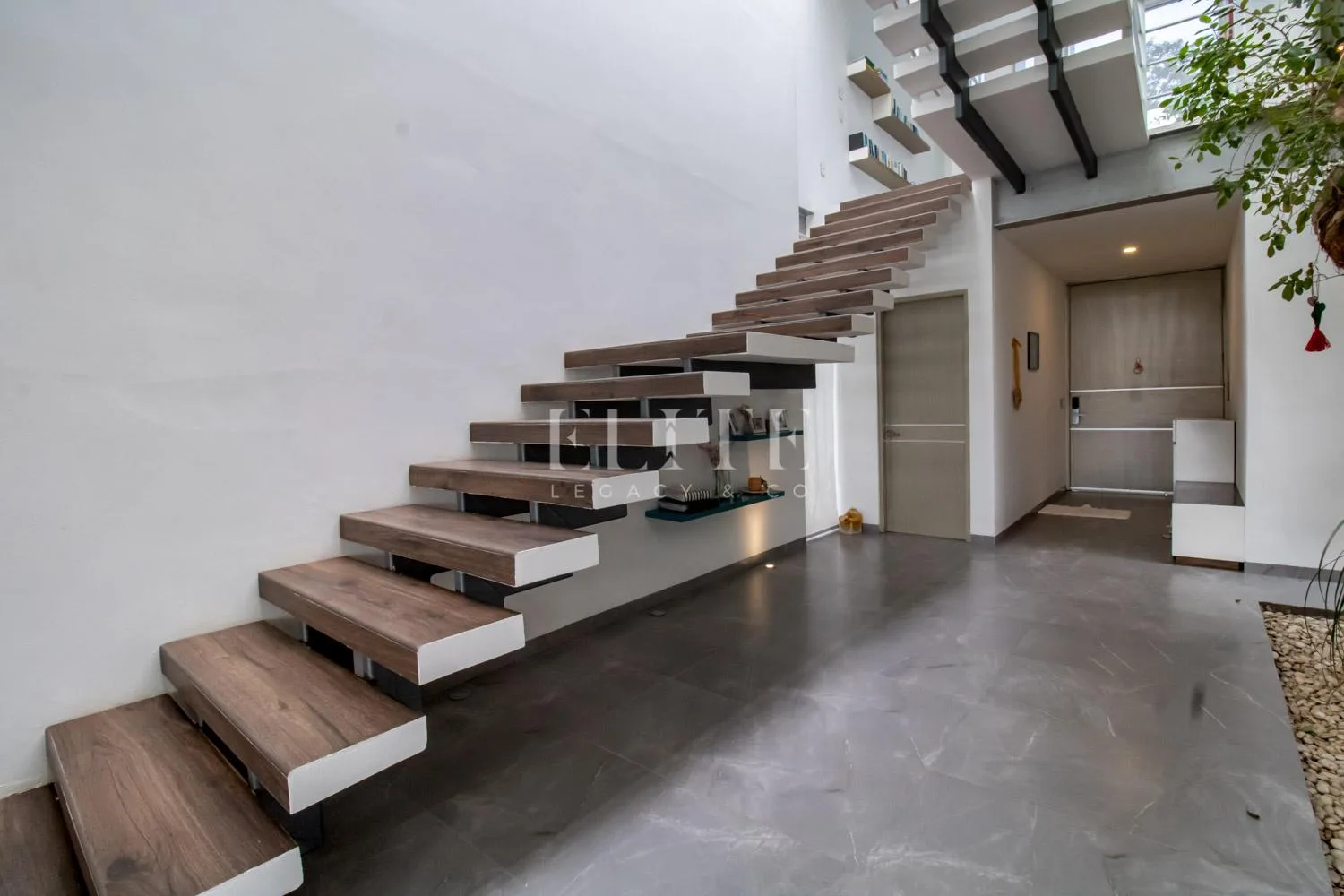 On the first level, there is a grand height living room, a double-height dining room with a 13-meter ceiling, and a 40-square-meter glass ceiling. An internal garden includes an 8-meter tall poplar tree. A large study has access from the exterior. This level also features a full bathroom, an equipped integral kitchen with all-electric appliances, an island, and a breakfast bar, a pantry, a terrace with a sunken round living area, a grill, a half bathroom, a large garden with a pool, a deck for kayaks, a dock for lake access, a laundry room, a service room with a full bathroom, two spacious service hallways, a very spacious storage room, and partially covered parking for six cars.