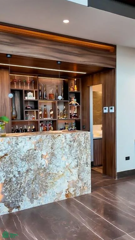 The main entrance opens to a double-height living room, which flows to a bar and a fully equipped kitchen. The hall features a water mirror with a bridge, and natural wood finishes are present throughout the home, including in a dedicated library.