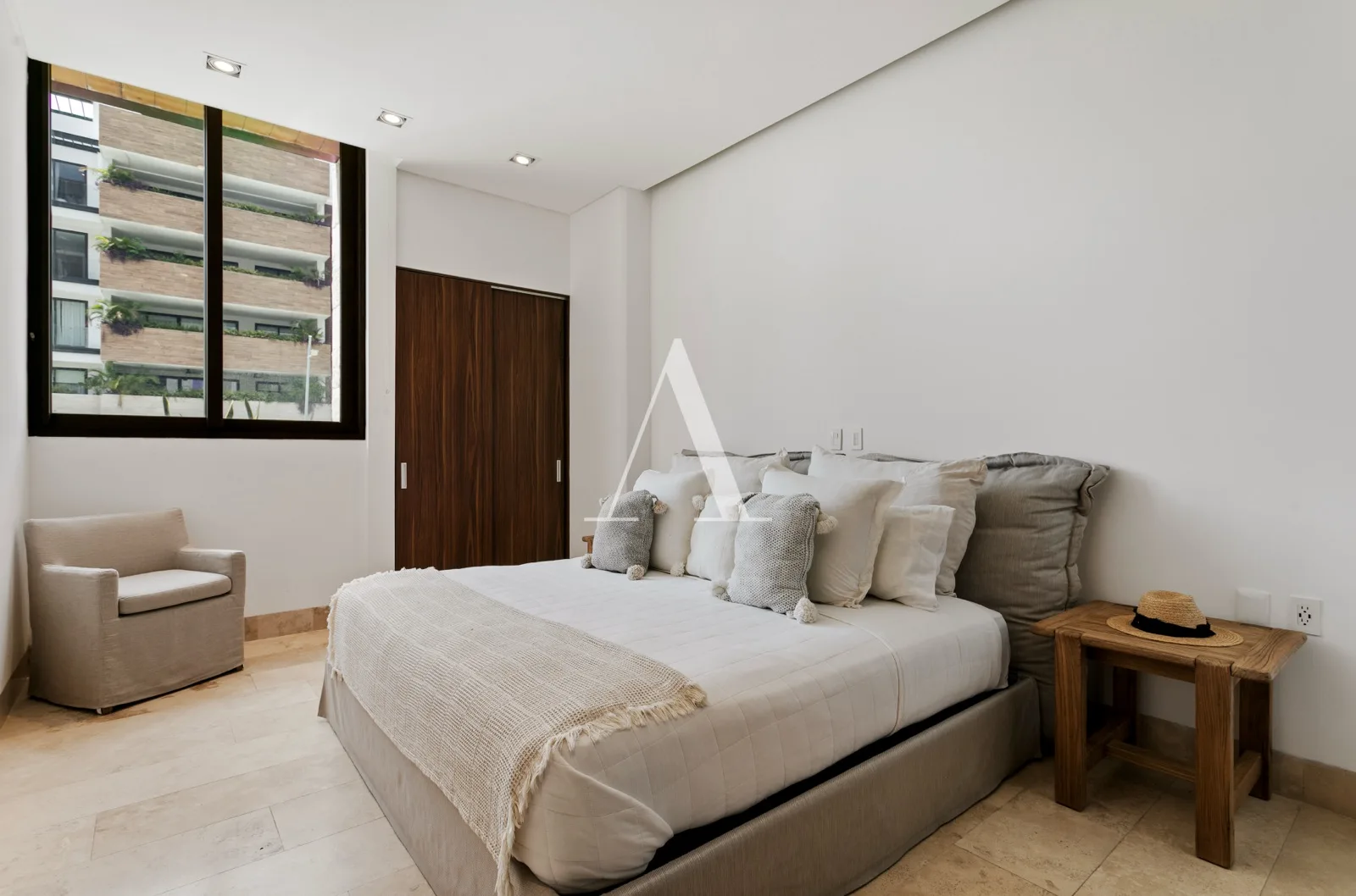 The unit consists of three spacious bedrooms. The primary bedroom has direct access to the terrace, a large walk-in closet, and a bathroom with dual vanities. The first secondary bedroom includes a closet, a bathroom, and an exterior view. The second secondary bedroom features a dressing area and an exterior view.