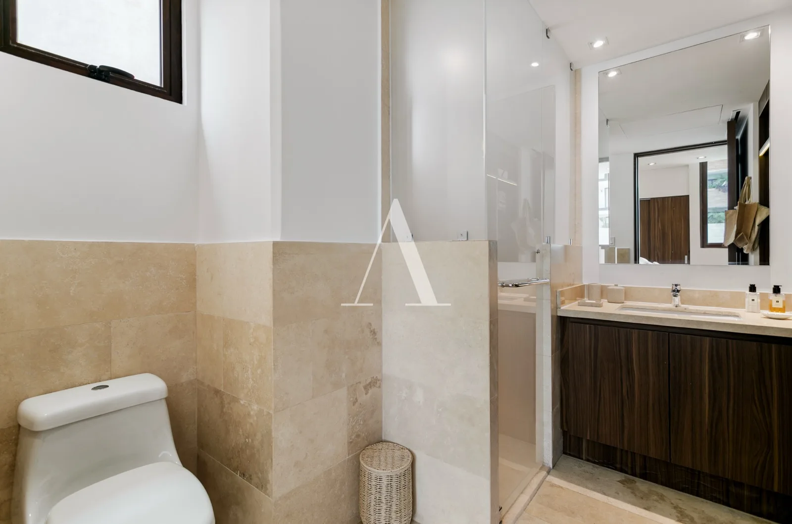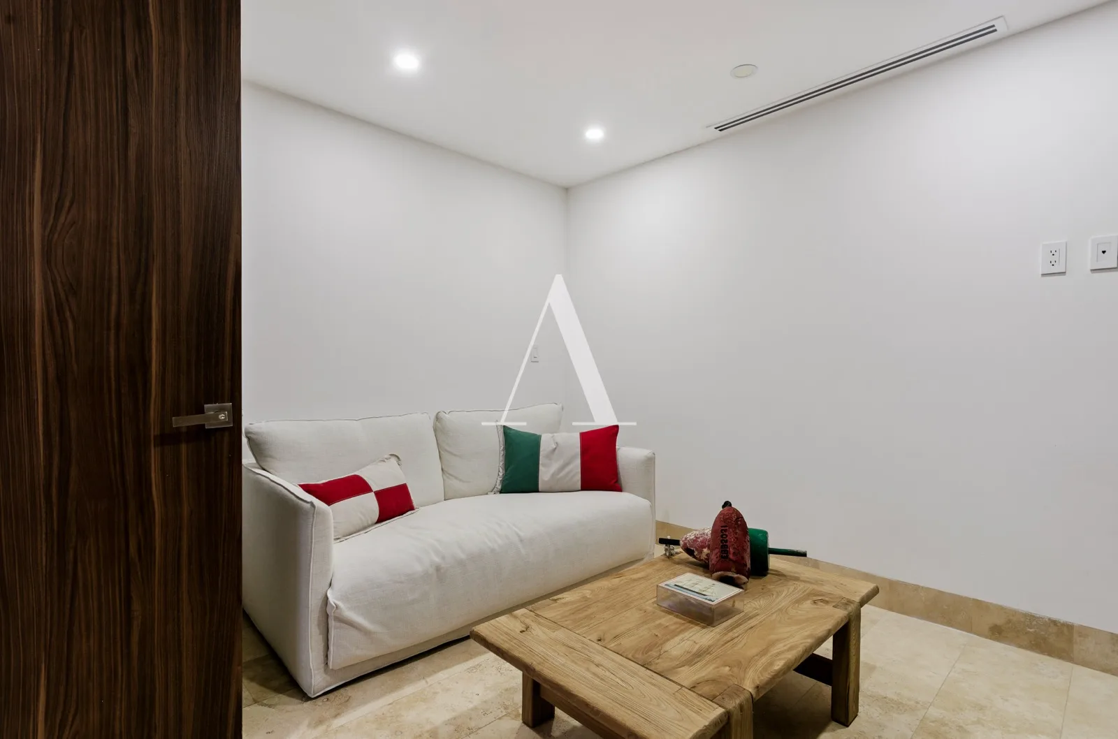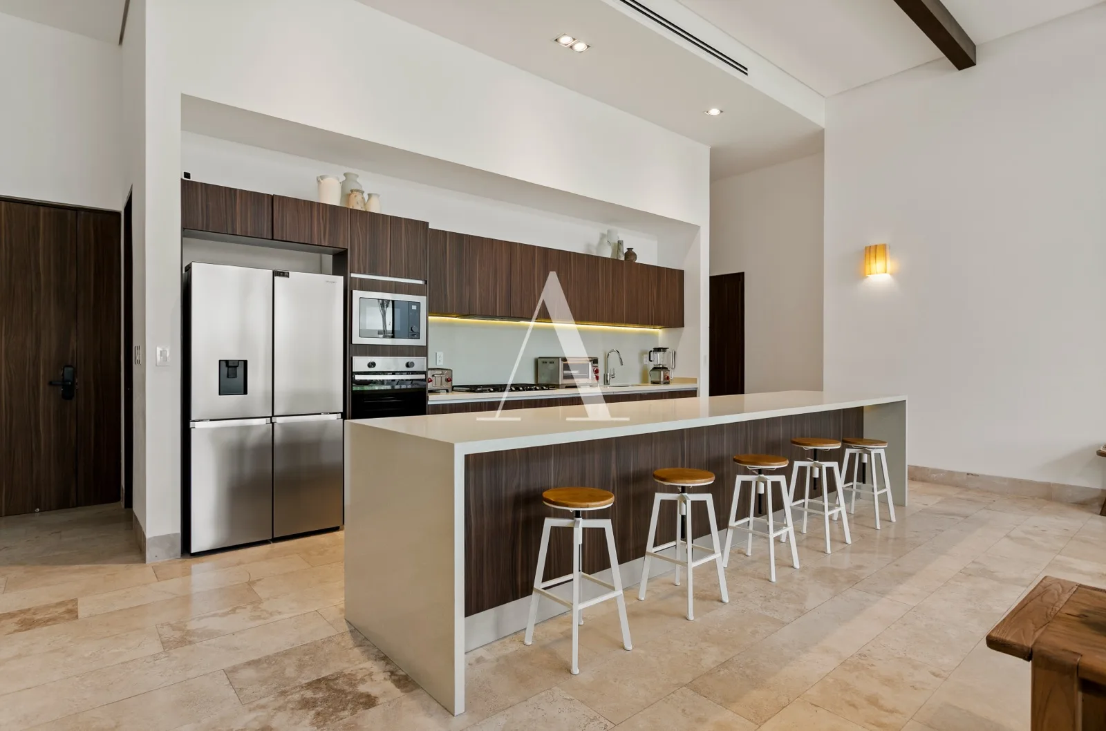 The residence is furnished and decorated in a minimalist style with warm tones. The expansive living and dining areas integrate seamlessly with the kitchen. The kitchen features a large quartz bar counter and is fully equipped with high-end appliances.