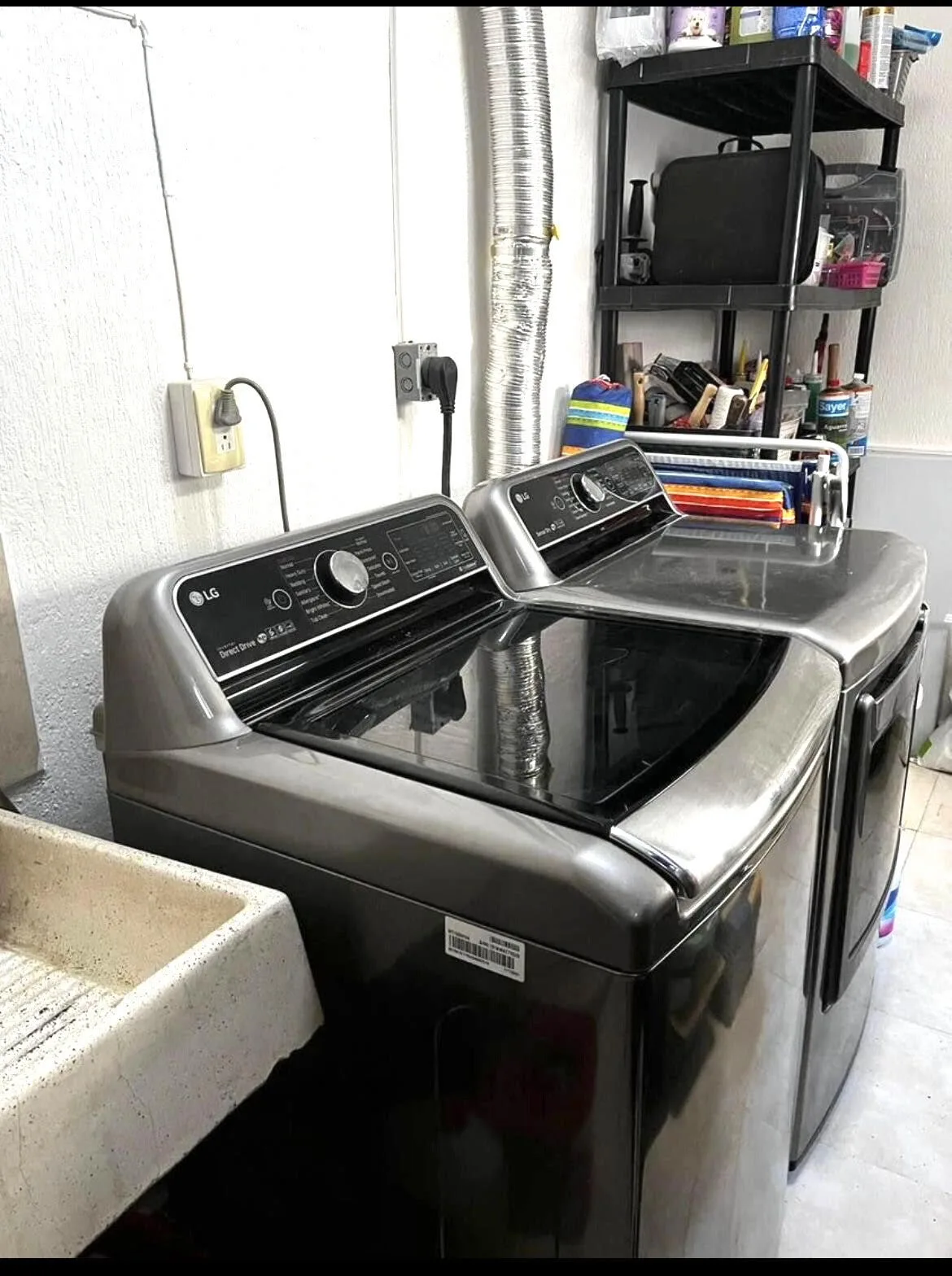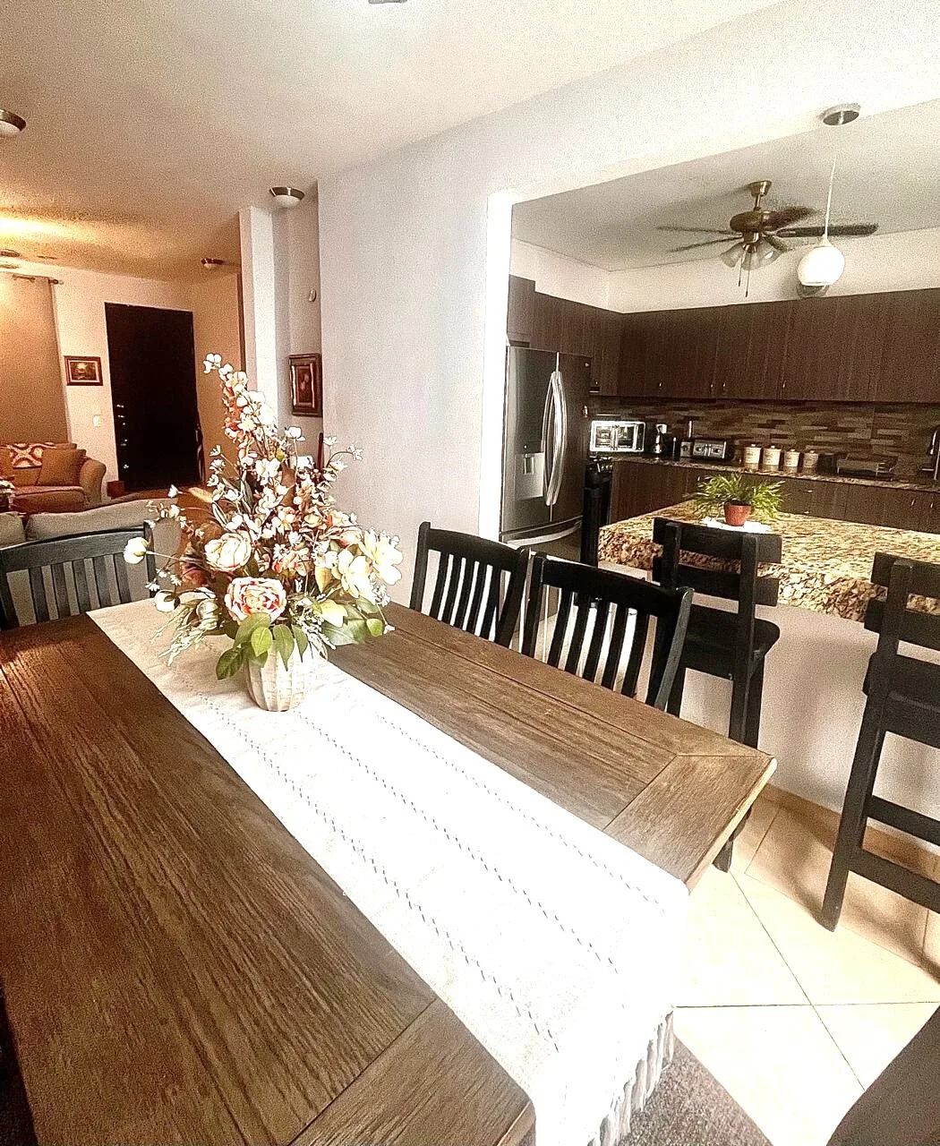 The ground floor includes a living room, a dining area, and a completely new external kitchen with marble countertops, a bar counter, and space for a dishwasher. A newly renovated half bathroom is on this level. The floor is equipped with a new mini-split inverter air conditioning unit and three ceiling fans. There is an additional living or office space. An internal laundry room has an external door, a sink, and designated space for a washing machine and dryer.