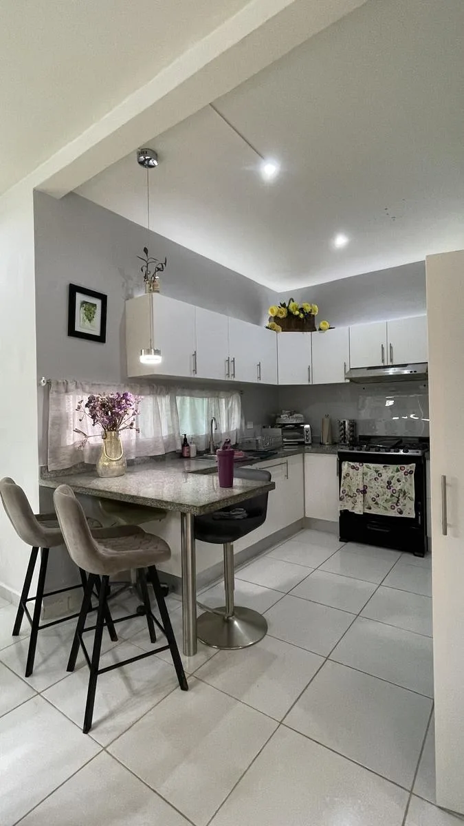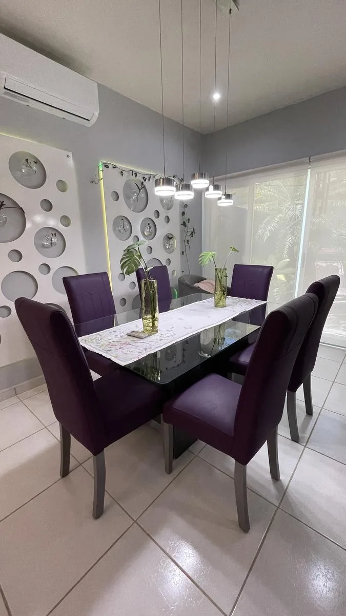 An enclosed utility room protects the washing machine and offers storage space, with capacity for three large bicycles. The patio is fitted with a retractable awning. The kitchen includes a compact rack for nine water jugs and enclosed pantry compartments. Decorative light fixtures are installed throughout. The master walk-in closet features a pull-out rack for purses plus specialized compartments. The interior paint has been freshly retouched. The air conditioning systems have received recent maintenance.