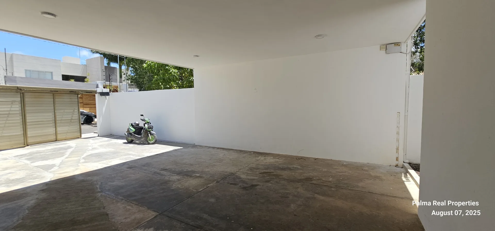 Exterior amenities include a covered terrace with a palapa, a large pool, and a garden. The garage accommodates four cars with an electric door. Additional spaces include storage, a laundry room, and service areas.