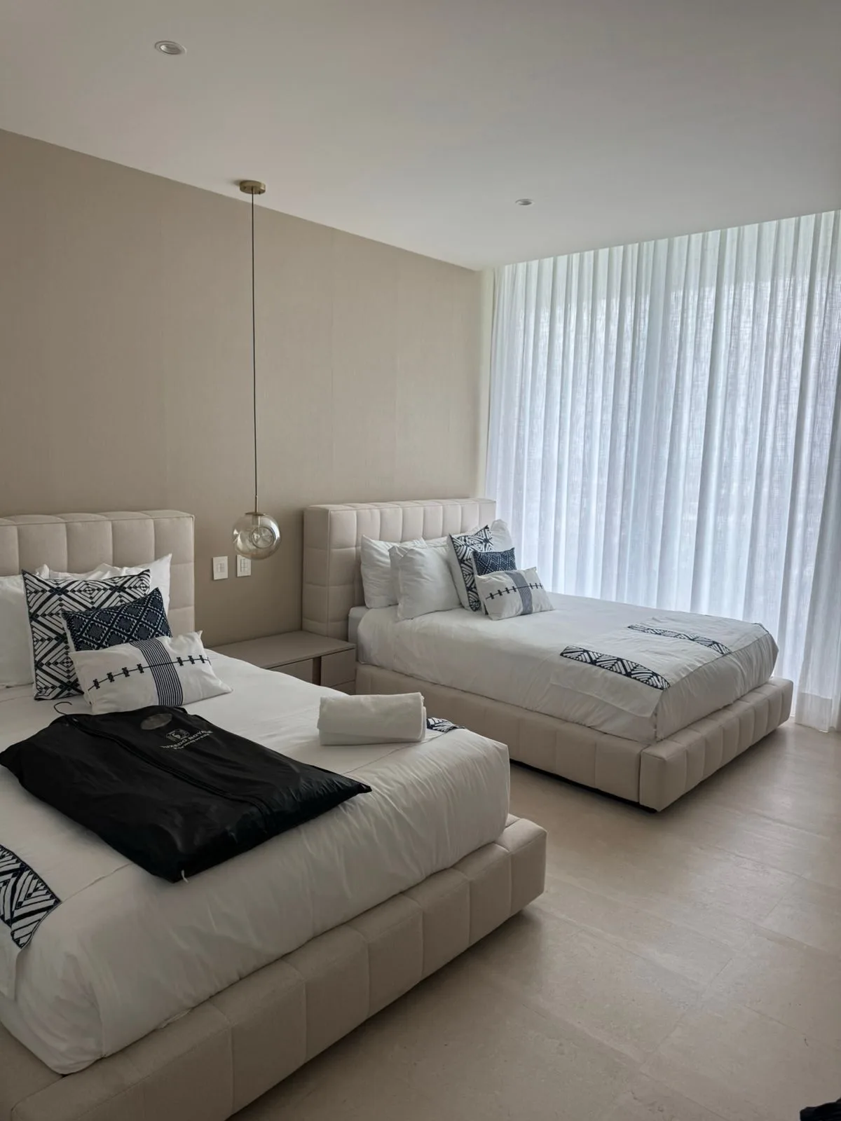 Building amenities include a spa, a gym, an infinity pool, a kids workshop, a pool lounge, and a padel court.