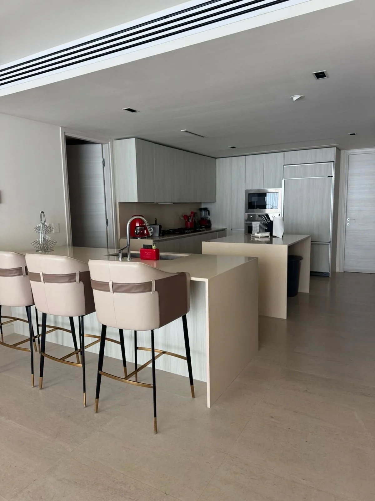 This residence is located on the 17th floor and encompasses 319 square meters. The layout includes a living room, a dining room, and a spacious kitchen. A terrace offers a view of the sea.