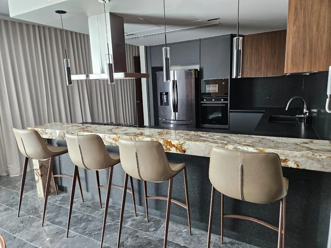 The penthouse features three bedrooms, each with a walk-in closet and an en-suite bathroom offering panoramic views. It includes a service room with a bathroom and closet. The living and dining area receives ample natural light and provides panoramic vistas, and contains a half bathroom. The residence is equipped with a gourmet kitchen and private terraces with views.