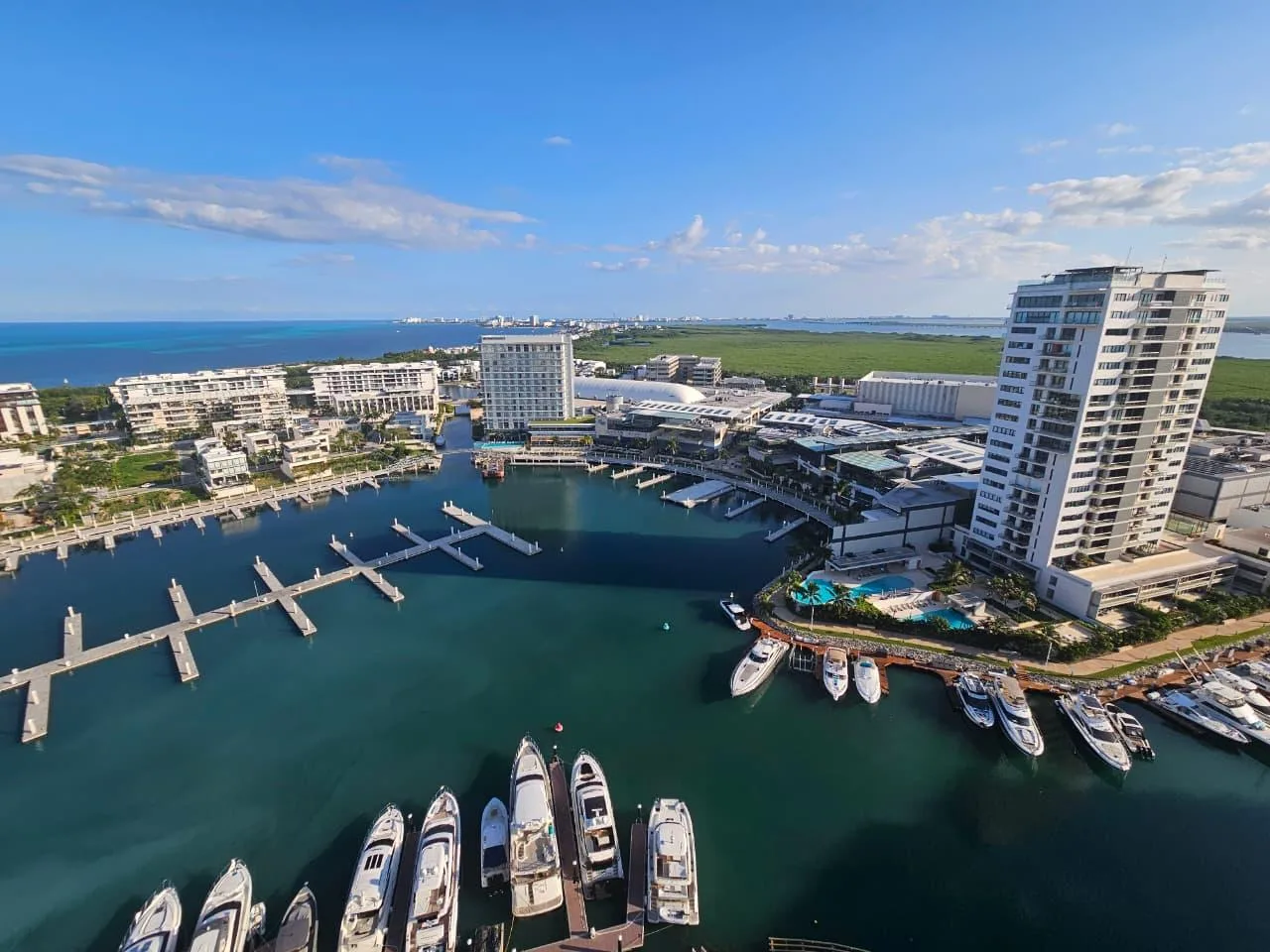 The location offers panoramic views of the Caribbean Sea and the Puerto Cancún marina, with sunsets. The area includes an active marina with nautical services, restaurants, boutiques and shopping, and access to golf courses, clubs, and sports amenities. It is situated near Cancún and the international airport, within a secure and modern environment.