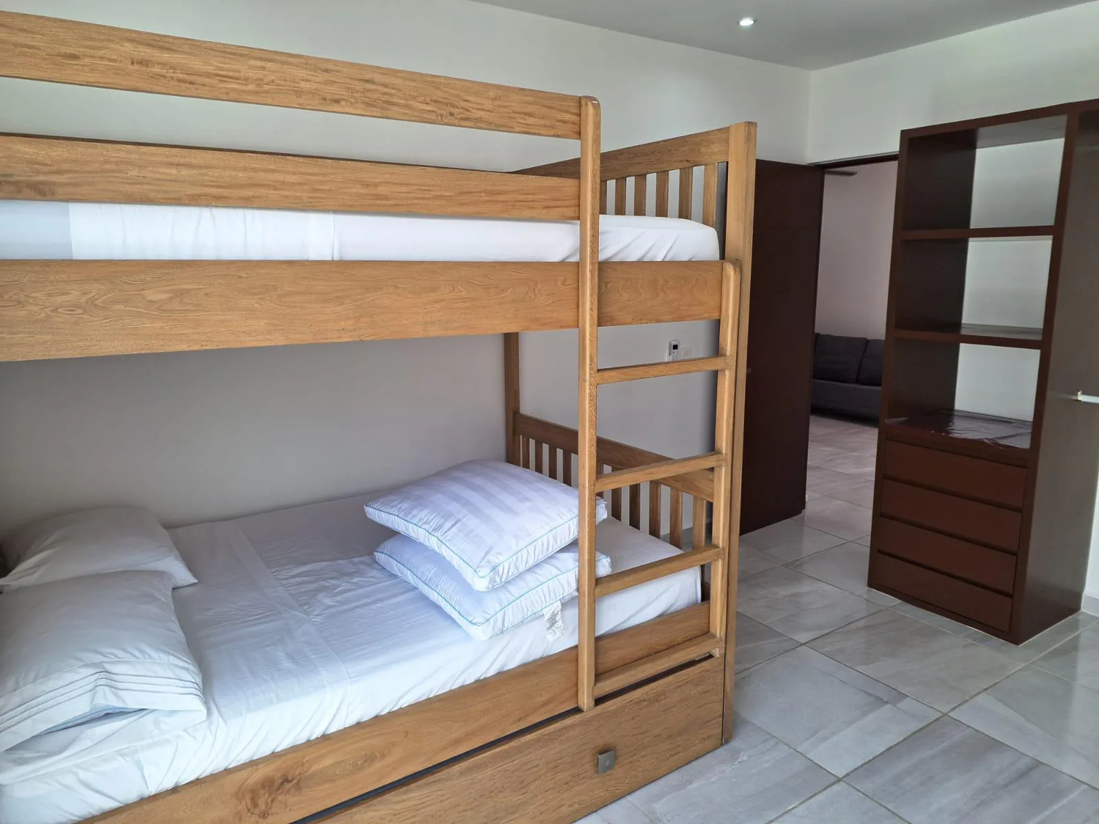 This furnished home comes complete with a curated selection of high-quality furniture and accessories. The well-equipped kitchen includes all necessary appliances. The living room features a comfortable sofa set and a dining set for six. The bedrooms are furnished with a queen-size bed and nightstands, a double bed with nightstands, and a bunk bed that accommodates two double beds and one single bed. A sofa bed and a television are also provided.