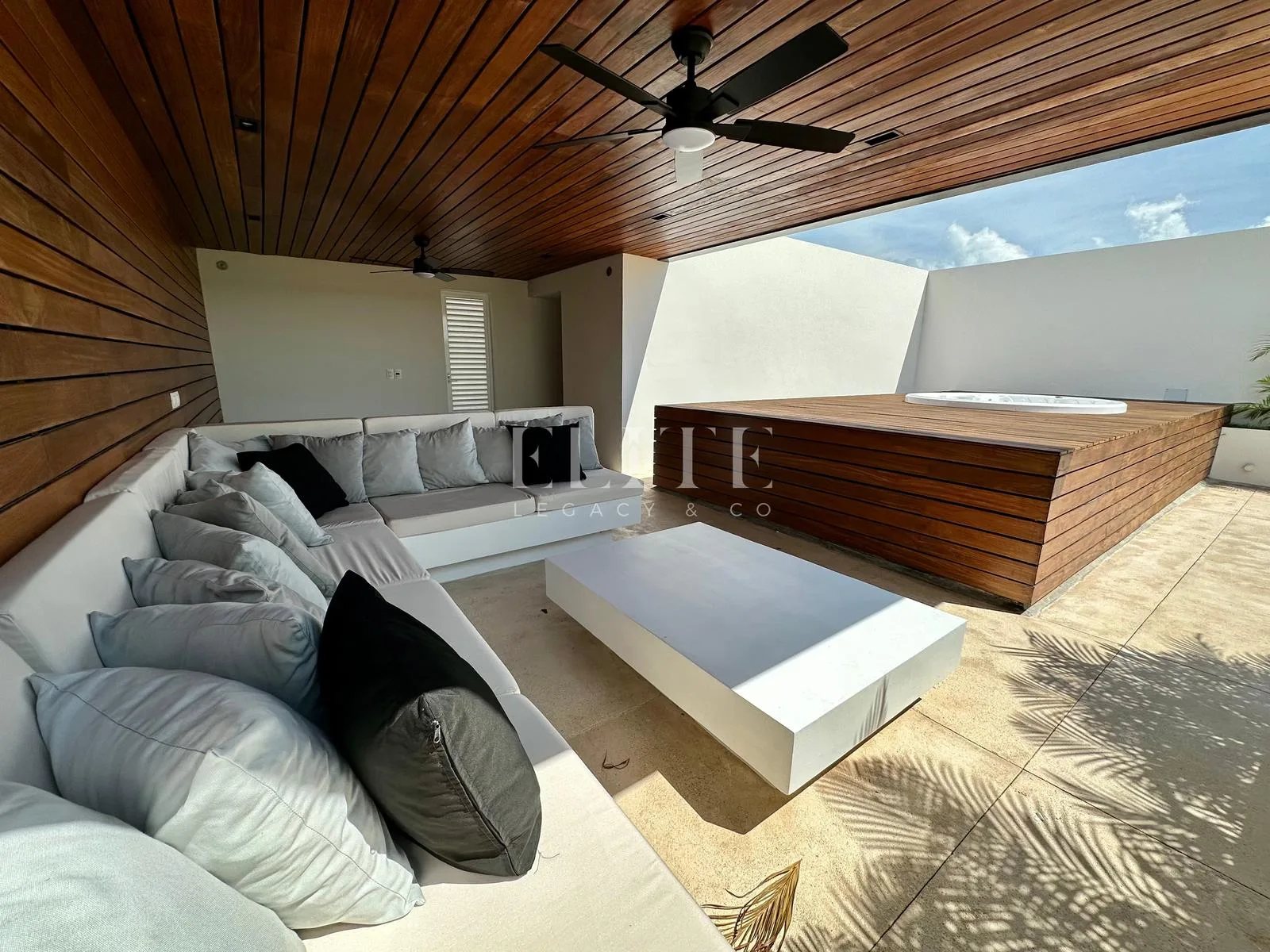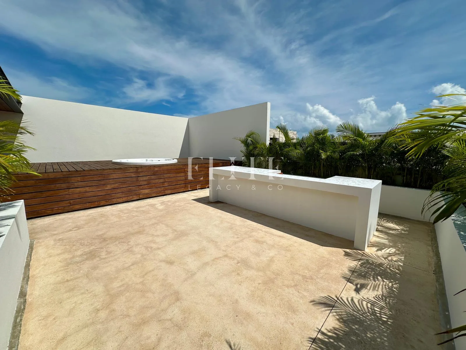 The rooftop level offers an outdoor living area, a sun deck with a jacuzzi, and a service bar with space for a grill.