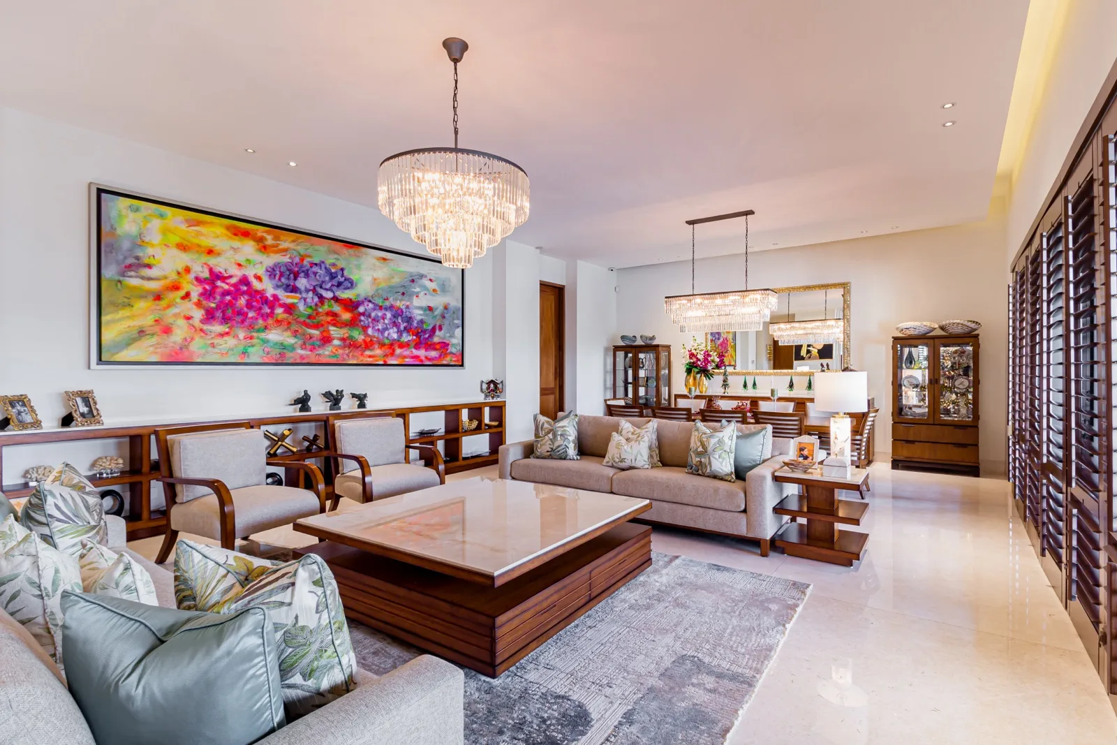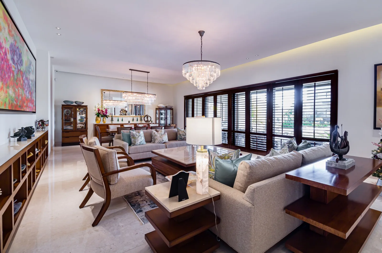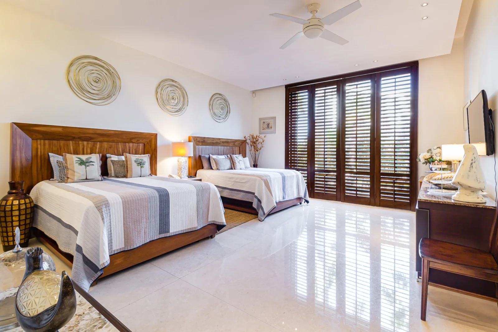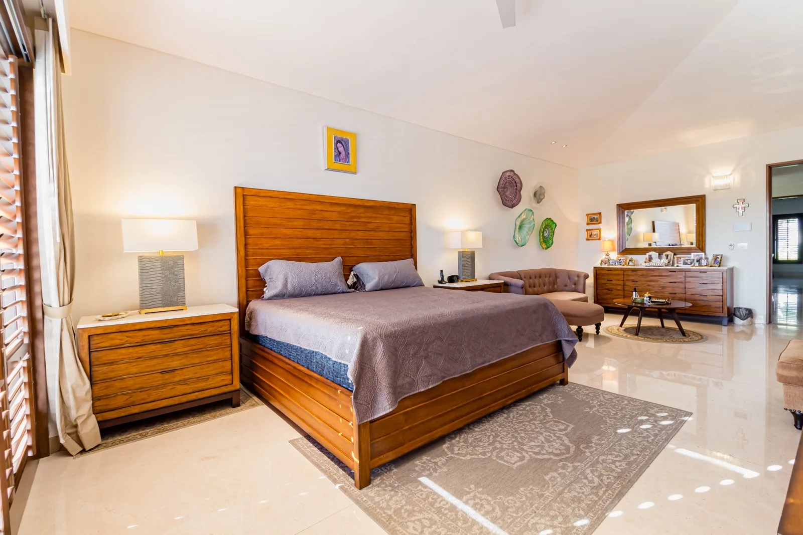 The property includes discreetly integrated hurricane-rated roller shutters, uniform marble flooring, and high-strength Fleetwood aluminum windows. These windows are suited to the local climate due to their resistance to humidity, wind, and salinity, while maximizing natural light and views.