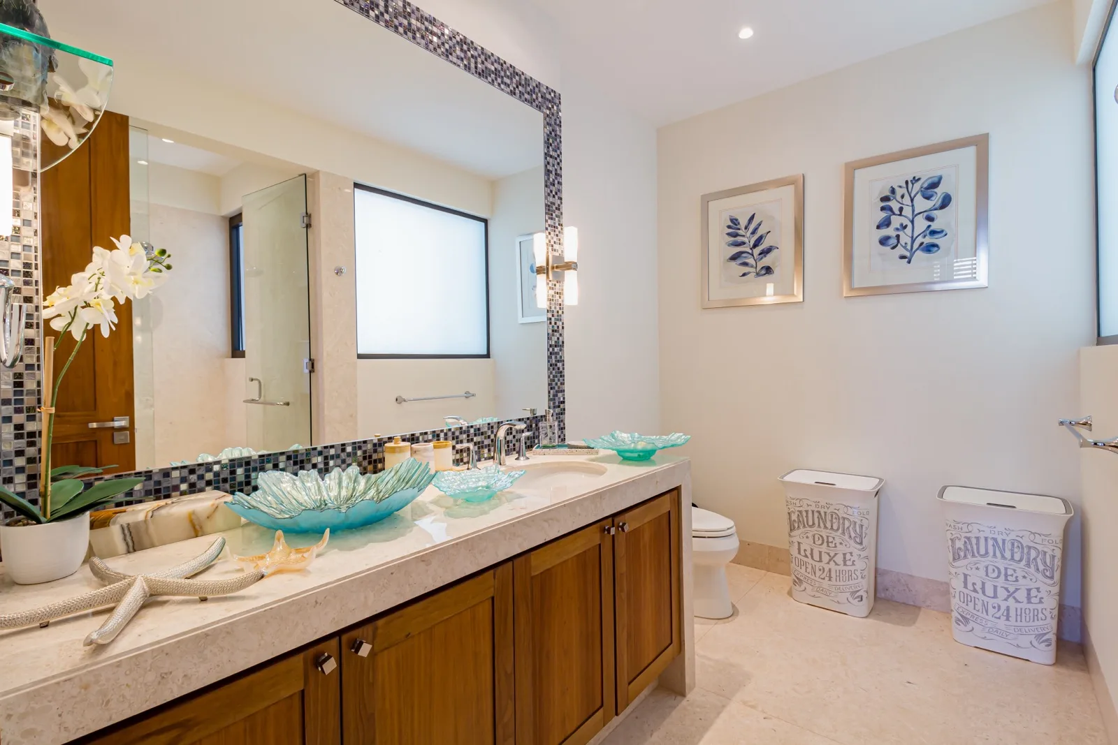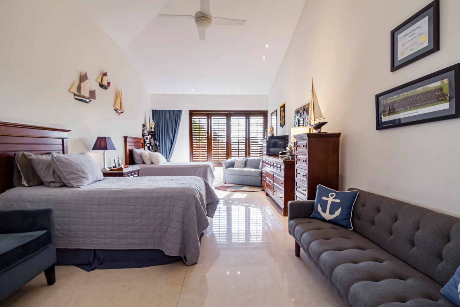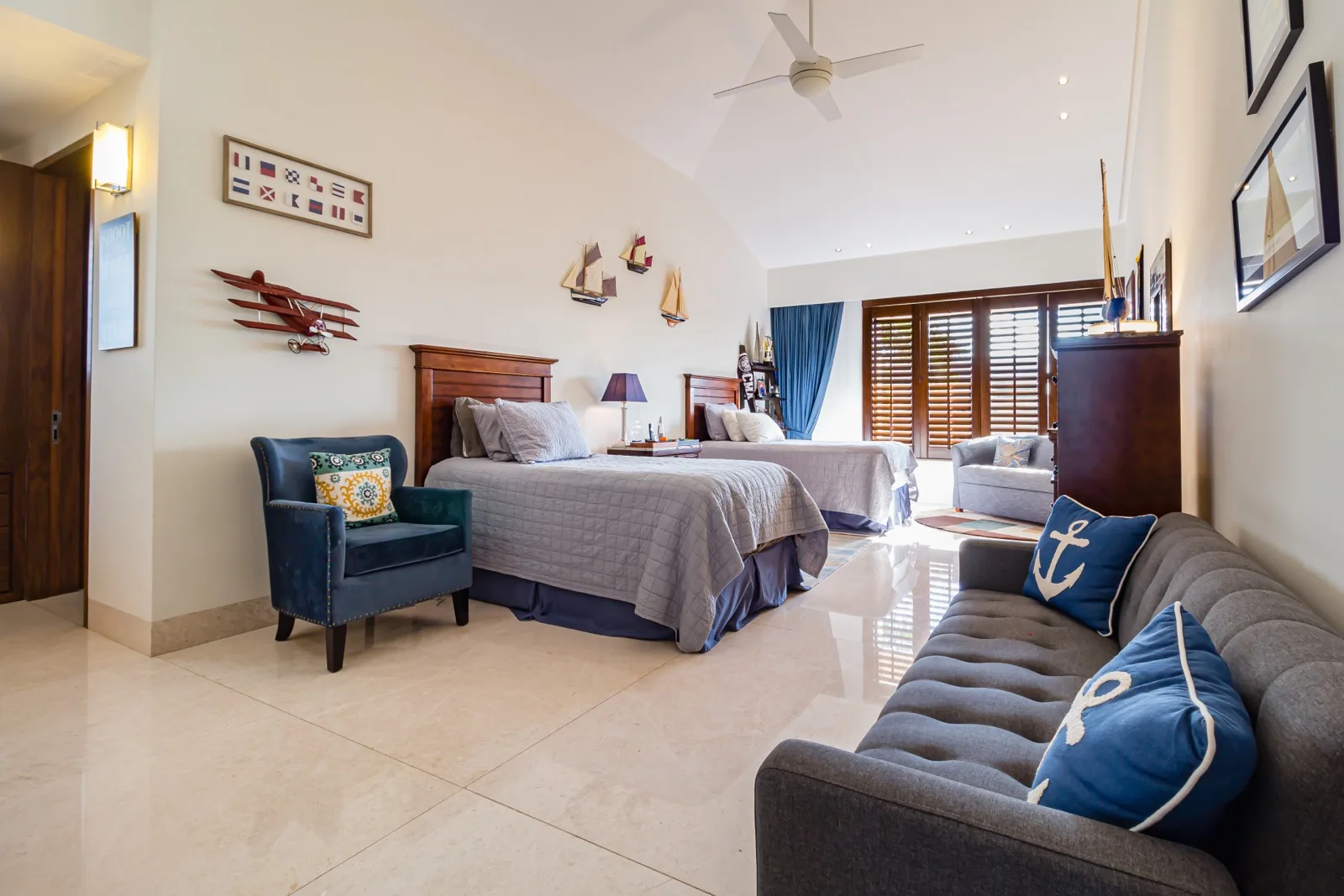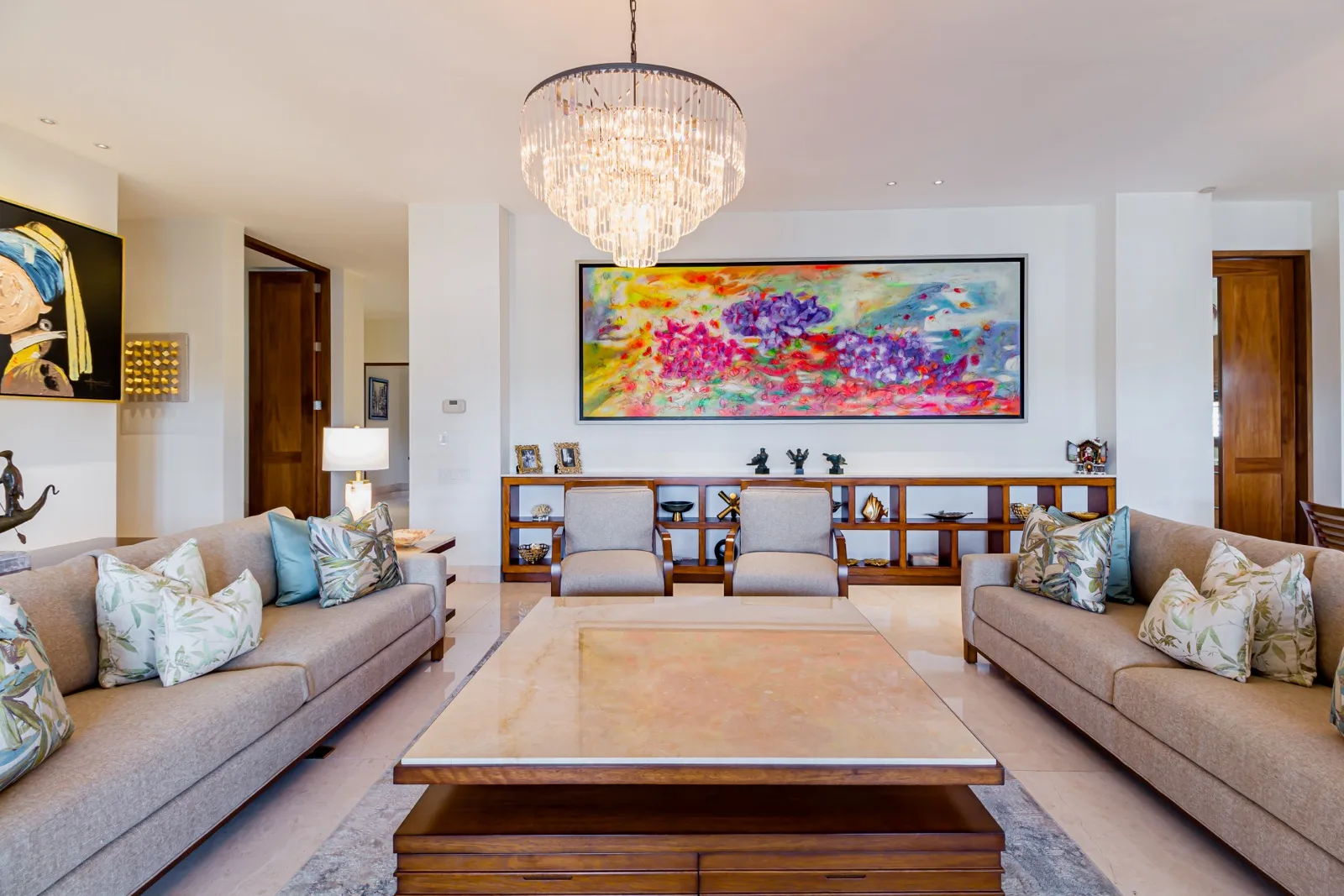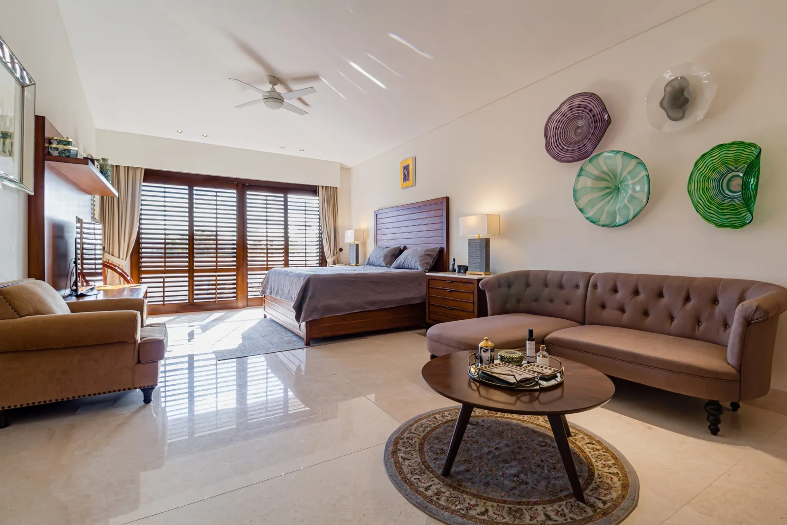 The property includes discreetly integrated hurricane-rated roller shutters, uniform marble flooring, and high-strength Fleetwood aluminum windows. These windows are suited to the local climate due to their resistance to humidity, wind, and salinity, while maximizing natural light and views.