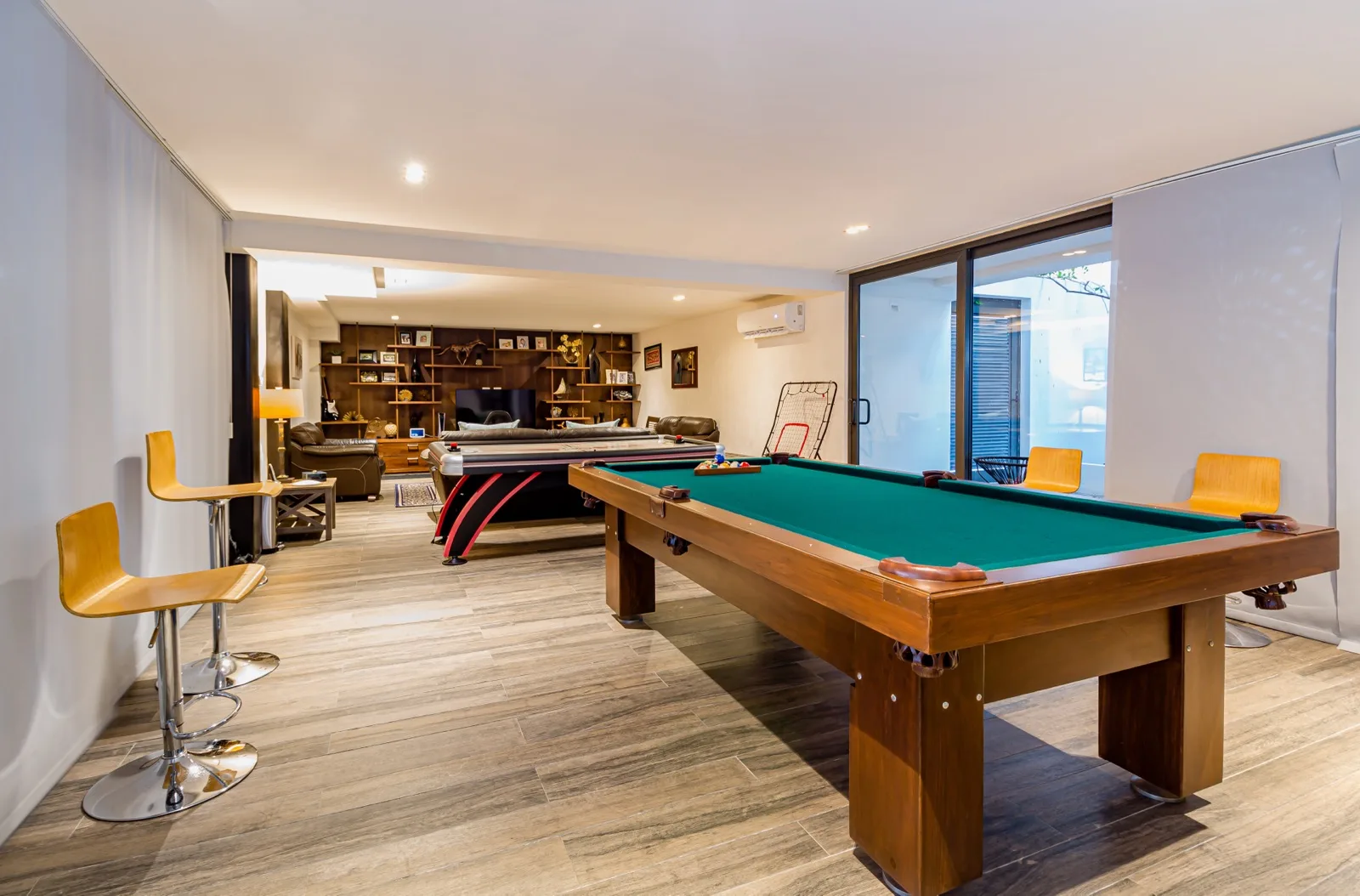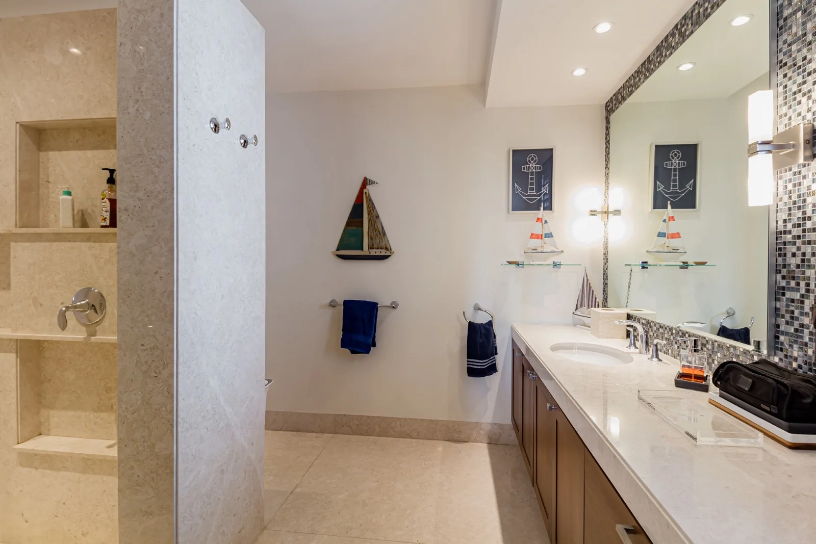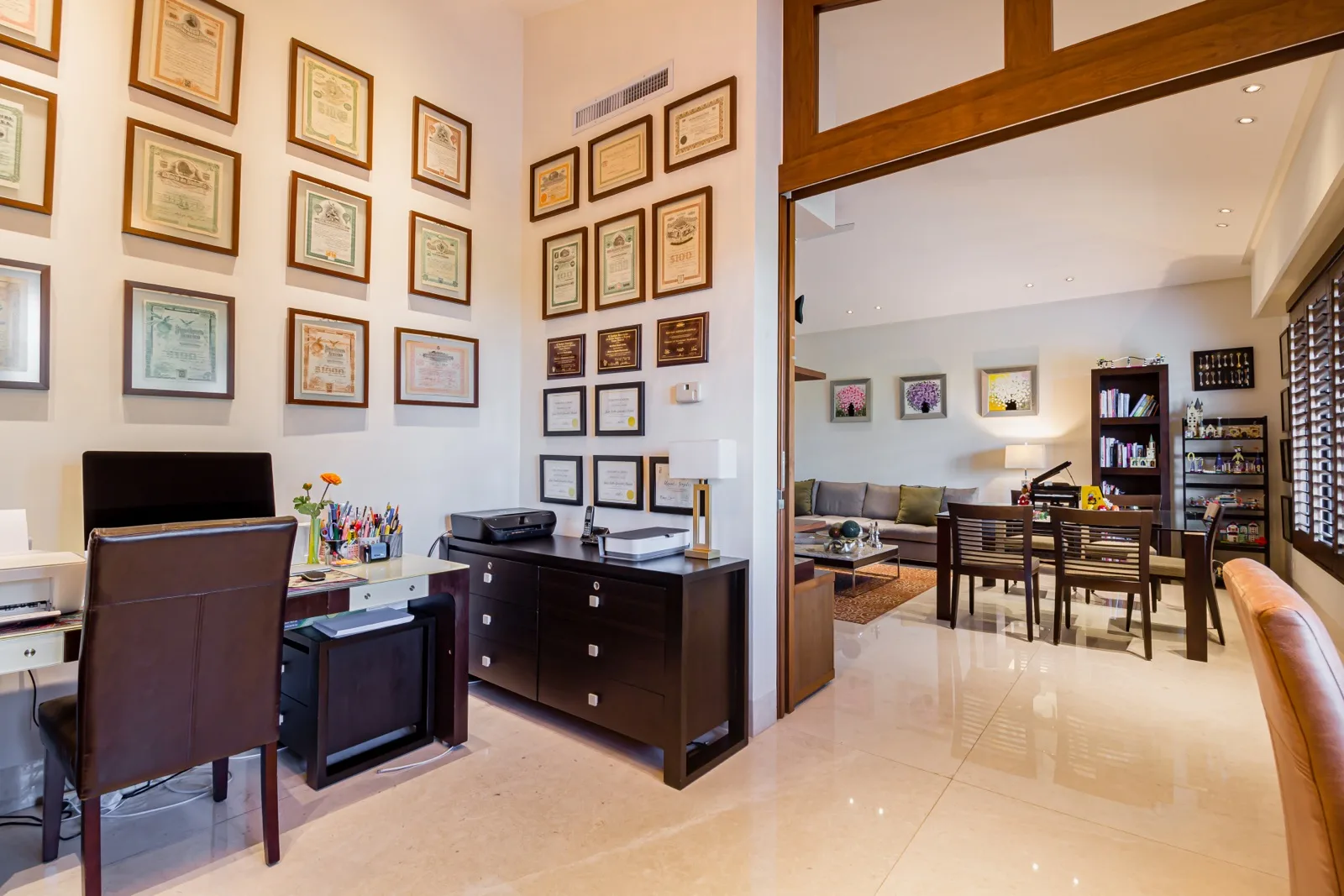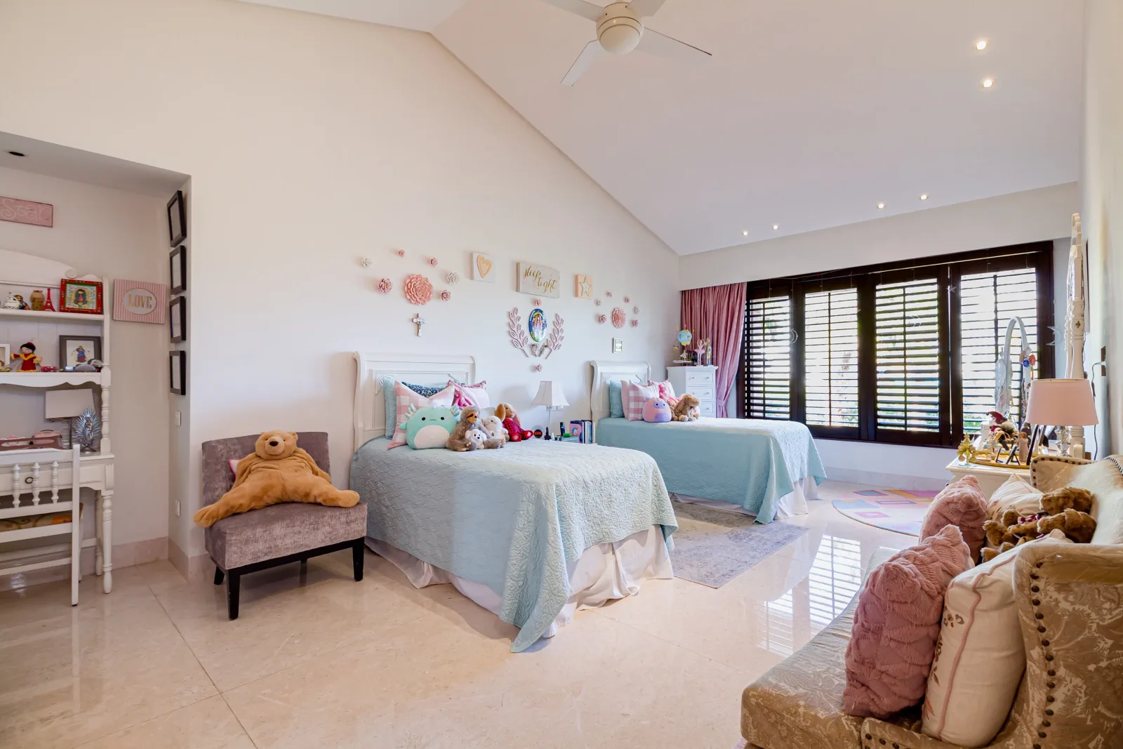 The property includes discreetly integrated hurricane-rated roller shutters, uniform marble flooring, and high-strength Fleetwood aluminum windows. These windows are suited to the local climate due to their resistance to humidity, wind, and salinity, while maximizing natural light and views.