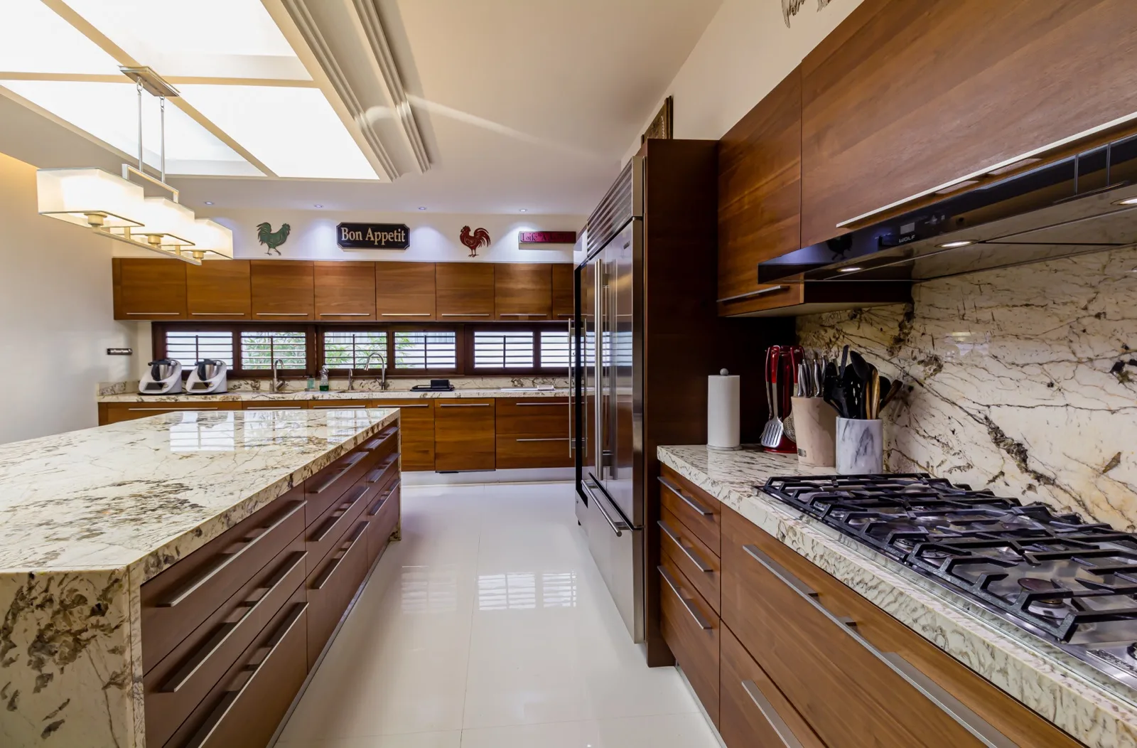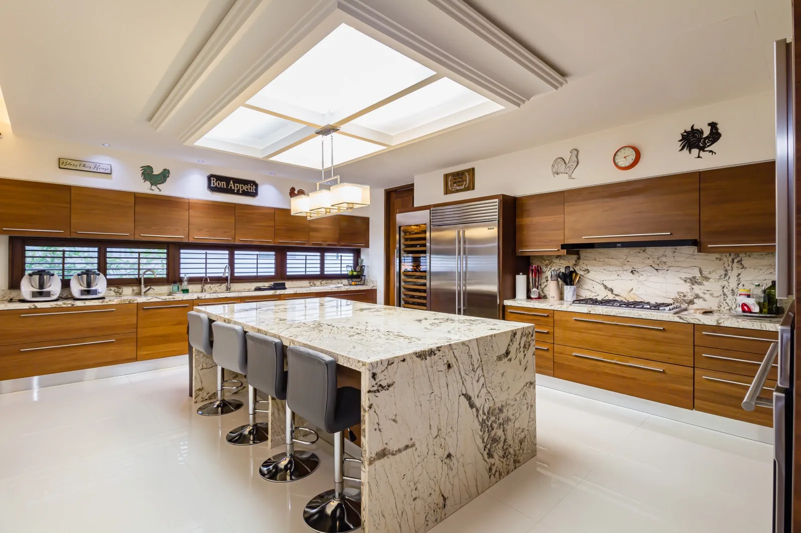 The chef's kitchen is equipped with a Sub-Zero refrigerator and wine cooler, a Viking range, and a Wolf oven and microwave. On the ground floor, the social areas connect to a covered terrace overlooking the garden, swimming pool, and canals. This level includes a living room, dining room, bar, and an informal family gathering area, plus one bedroom.
