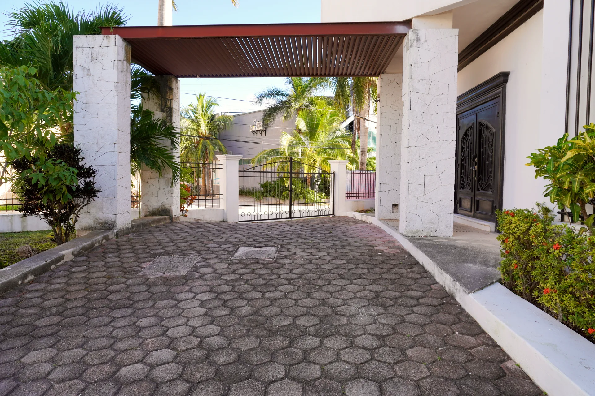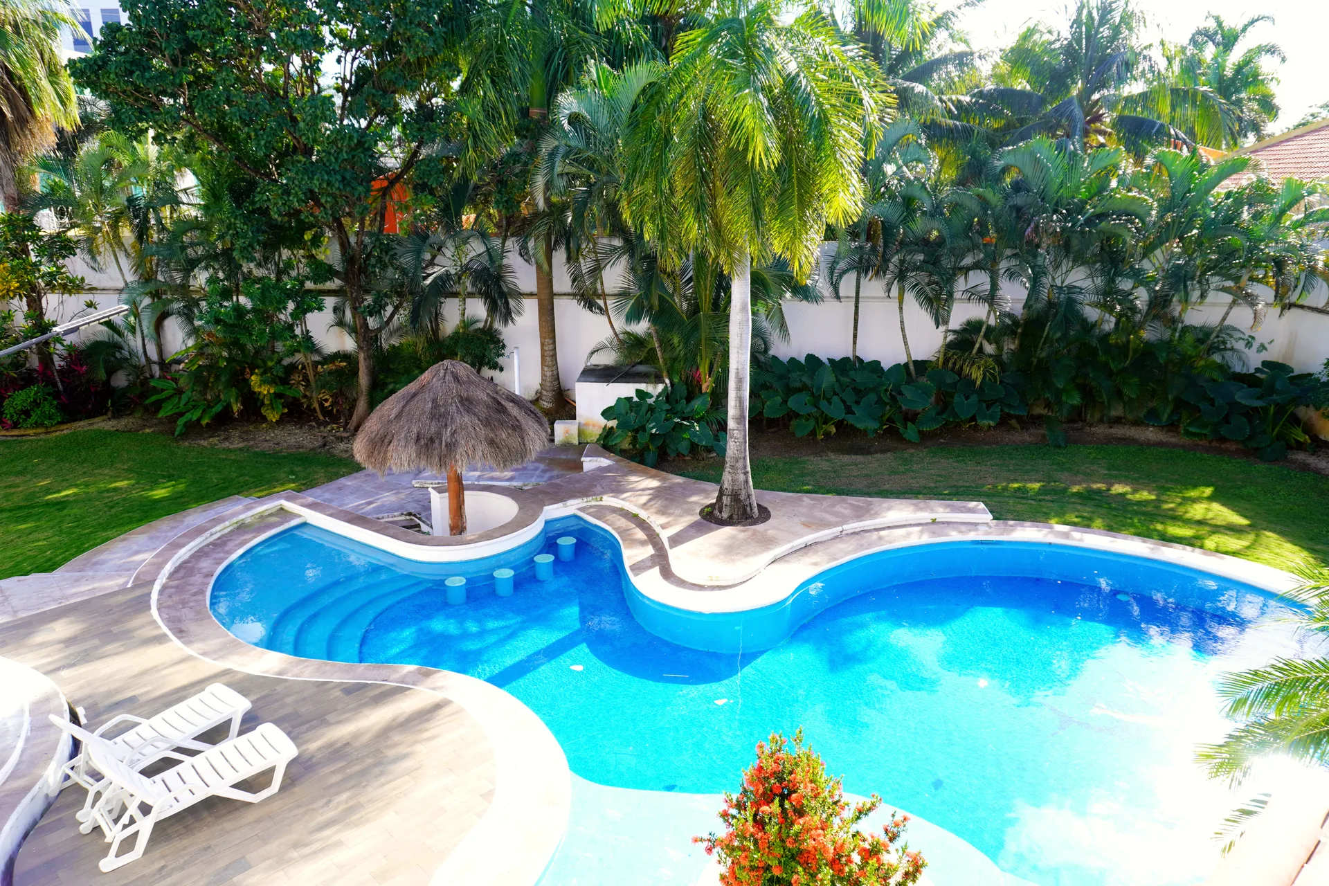 The 1, 239 square meter garden provides ample space. The swimming pool has areas of varying depths, suitable for all ages. A traditional thatched-roof palapa offers shaded space.