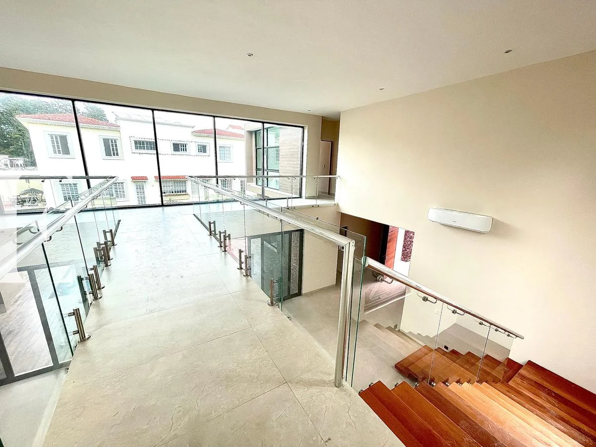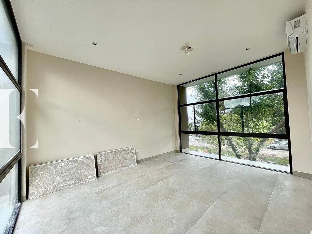The first level features a double-height living and dining room. There is a study or bedroom with a private bathroom, and a secondary bedroom with a walk-in closet and private bathroom. This level includes a fully equipped kitchen, a pantry, a service room with a private bathroom, and a storage room. It also has a swimming pool, a green backyard area, a service corridor, and covered parking for four cars.