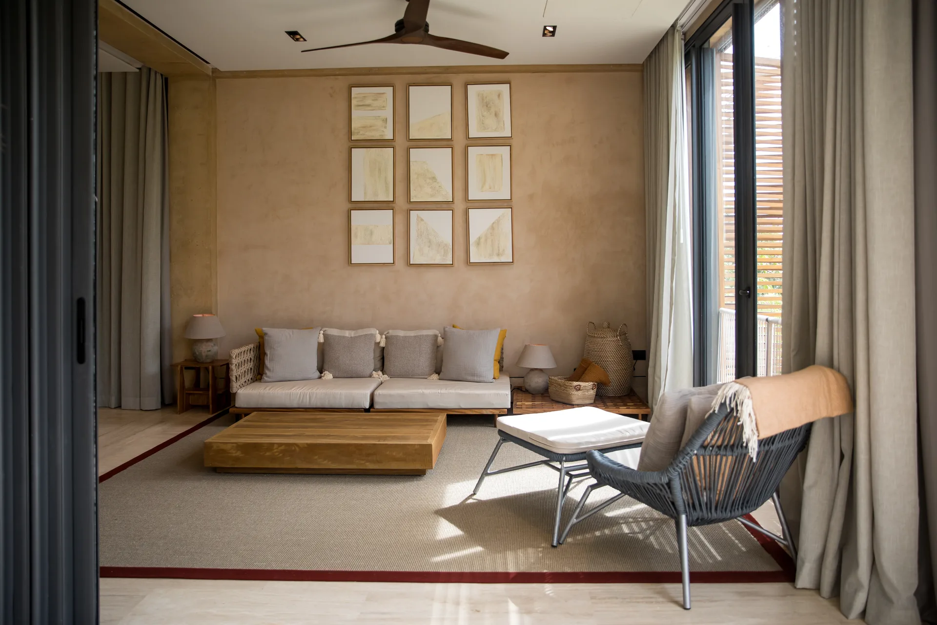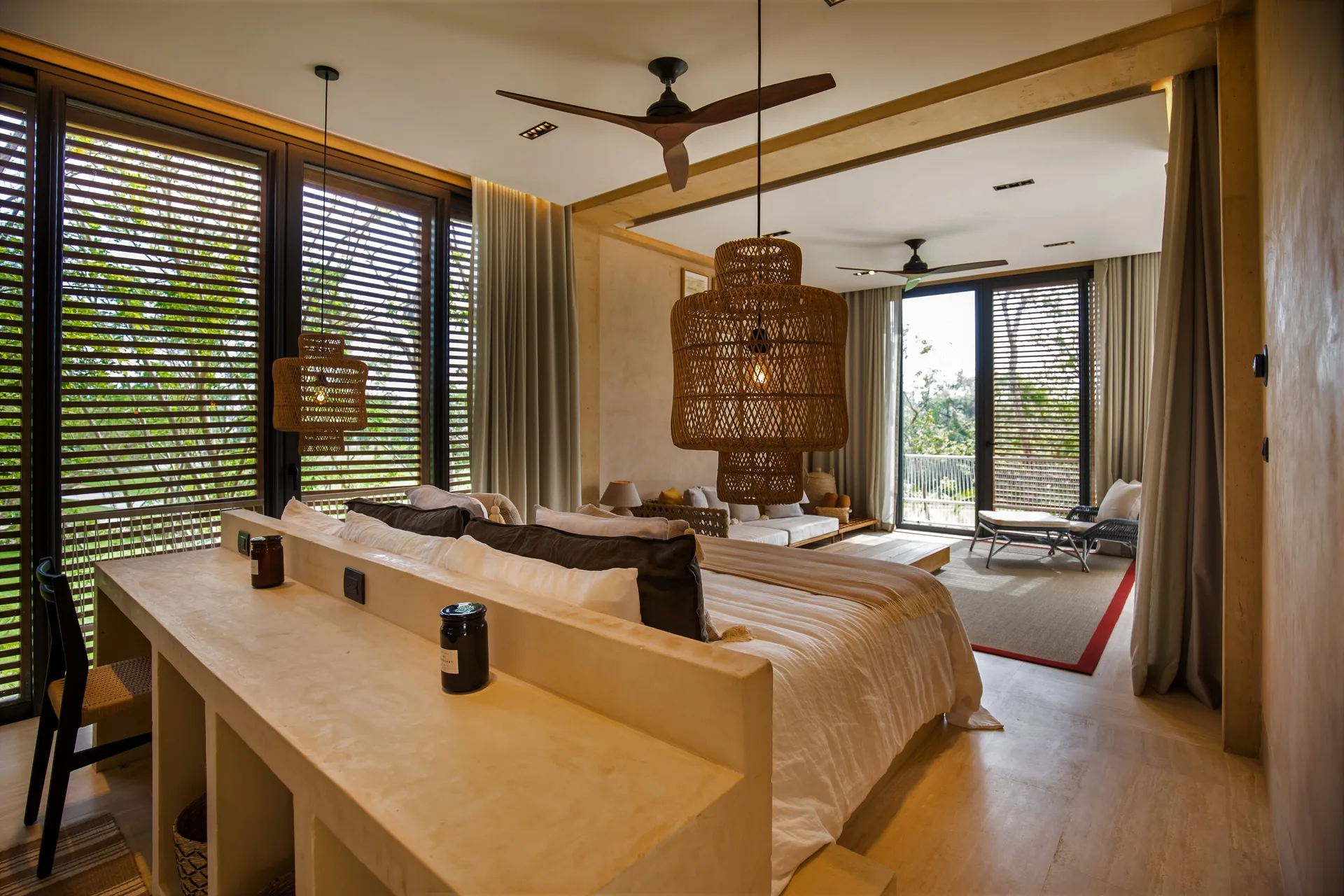 All bedroom bathrooms are designed with natural touches and feature windows and interior gardens. The family room provides access to the terrace and green views, creating a cozy space for gatherings.