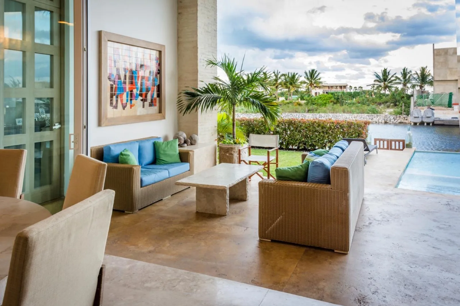The outdoor area features a swimming pool with a jacuzzi and a complete bathroom. The landscaped garden overlooks the canal. The property includes covered parking for two vehicles and additional uncovered space for four more. A private dock has capacity for a boat up to 60 feet in length.