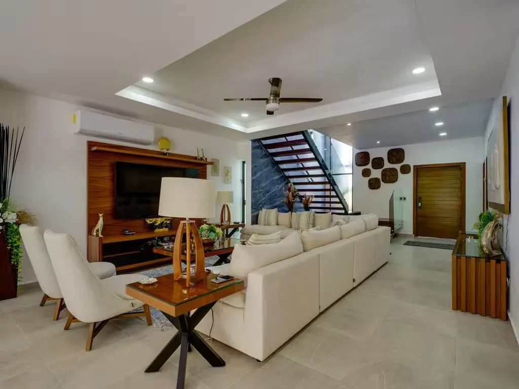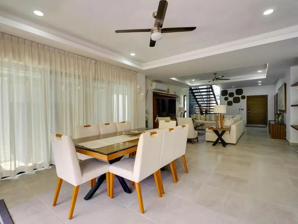 The interior layout includes suite-style bedrooms, each with spacious closets. The primary bedroom features walk-in closets and a dressing room. An elegant dining room offers a visual connection to the outdoor area. There are two common living rooms. The modern architecture provides excellent natural light and a perfect integration between indoor and outdoor spaces, creating a sophisticated and relaxing atmosphere. The home is designed to enjoy Cancun's tropical climate with open spaces and cross ventilation.