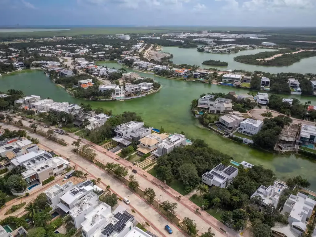 The Lagos del Sol community offers exclusive amenities including a natural freshwater lake suitable for kayaking, paddleboarding, and recreational activities. There is a premier clubhouse, communal swimming pools, a fully equipped gym, tennis and multi-use courts, extensive green areas and walking trails. The community provides 24/7 security with controlled access and features a low-density, high-end residential environment. It is one of the few residential developments in Cancun that combines natural, navigable lakes with luxury urban planning.