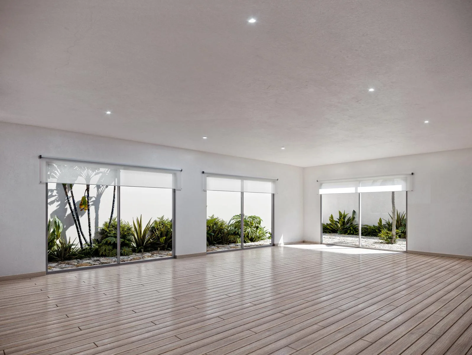 Carefully planned lighting creates an elegant and timeless atmosphere. The space is harmoniously integrated with the outdoors through large windows, allowing natural light and vegetation to become central features of the environment.
