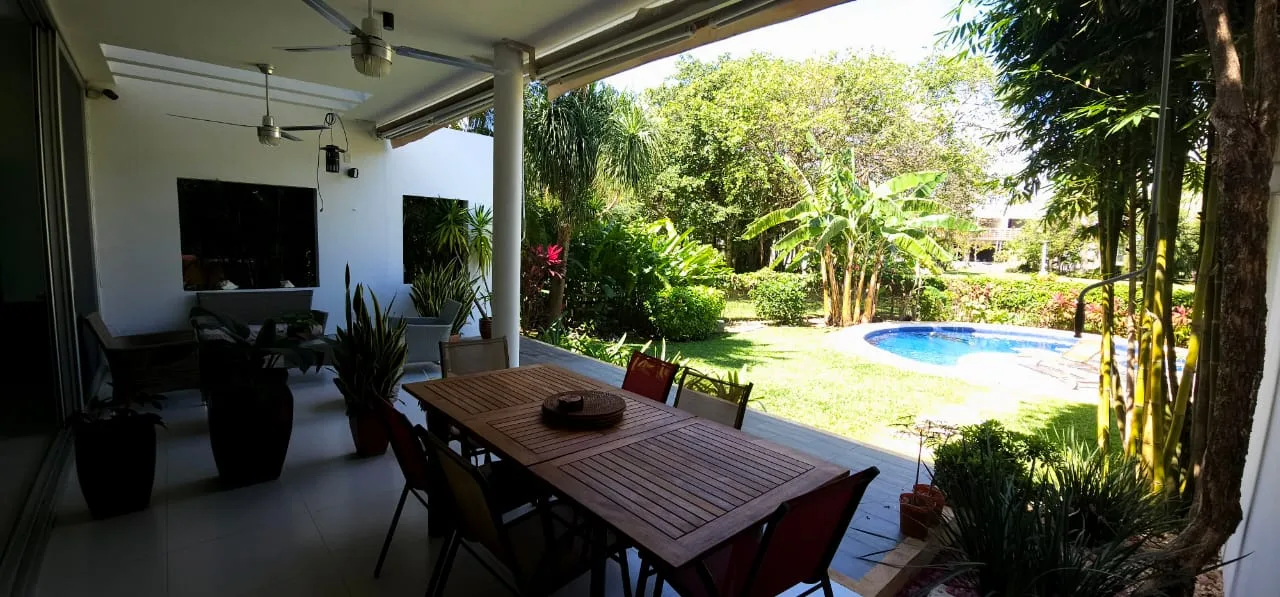 The residence includes parking for three vehicles, a private pool surrounded by lush green areas, and comprehensive 24-hour security. The maintenance ensures the property is kept in impeccable condition.