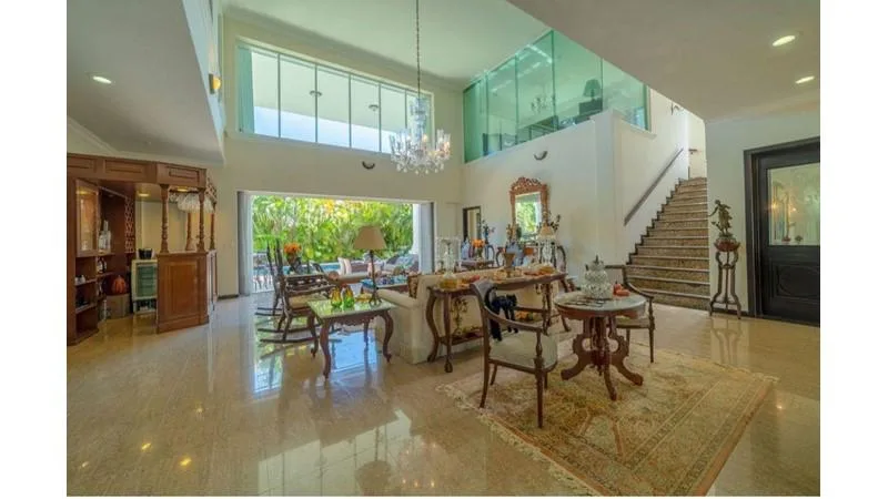 It features a spacious and bright living room with direct access to the pool and garden. The layout includes a foyer or hall, a bar, and a dining room. On the first floor, there is a bedroom with a full bathroom. The property includes a spacious kitchen equipped with a granite island, a utility room, and a laundry room. In total, there are five bedrooms with closets and four and a half bathrooms.