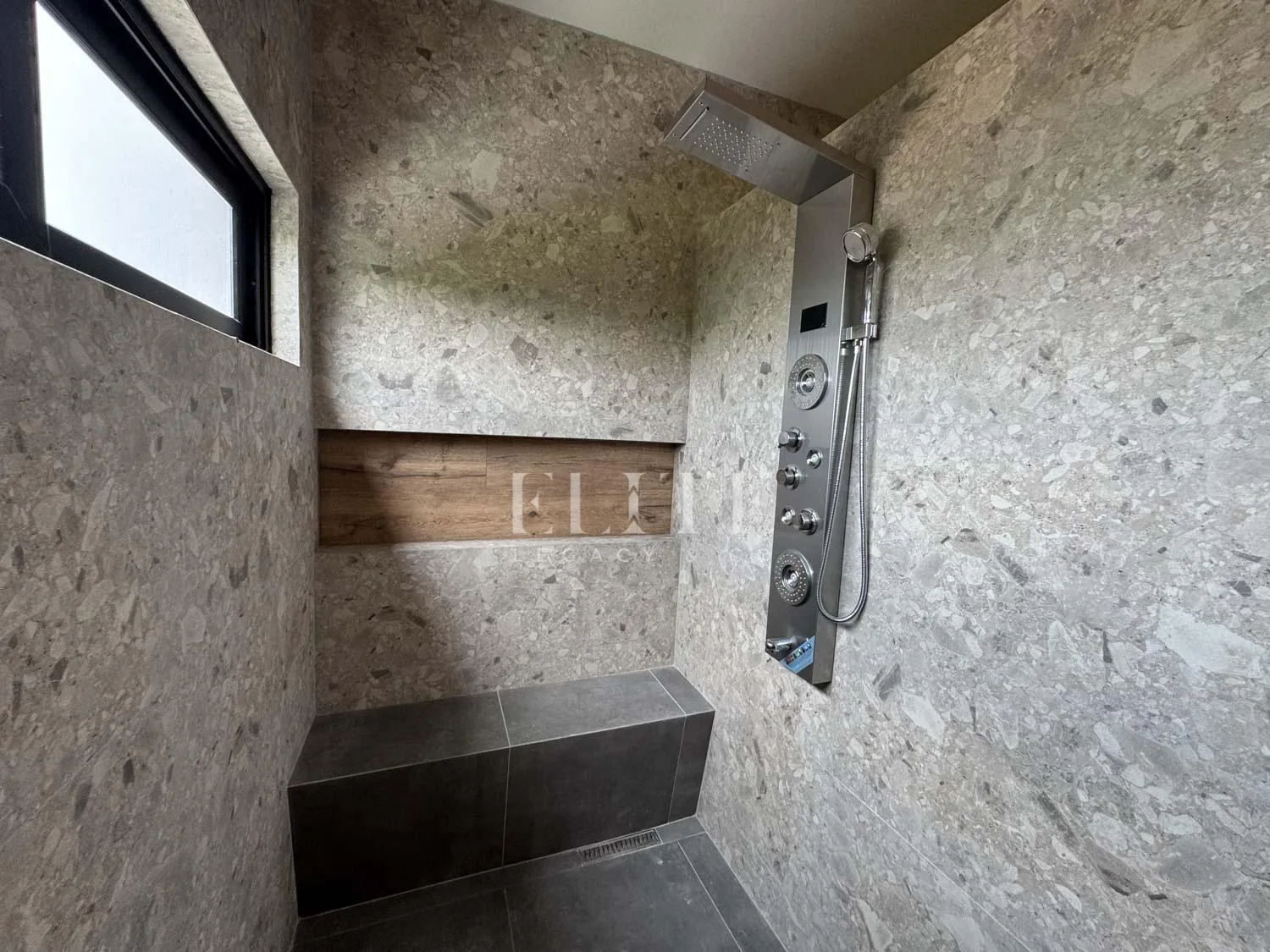 On the first level, the residence includes a living and dining room, an equipped integral kitchen, a pantry, a study with a full bathroom, a laundry room, a pool with a sunbathing area, a terrace, and covered parking for four cars.