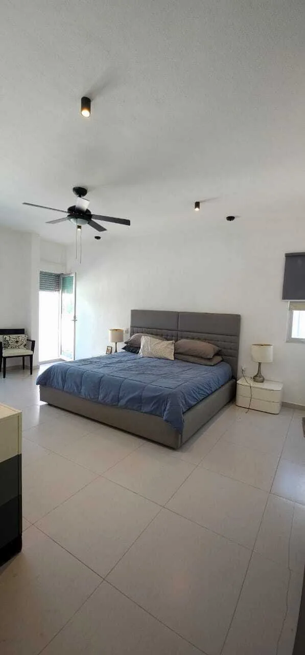 The residence includes three bedrooms, each with its own bathroom. The spacious living room is furnished and equipped with air conditioning and ceiling fans.