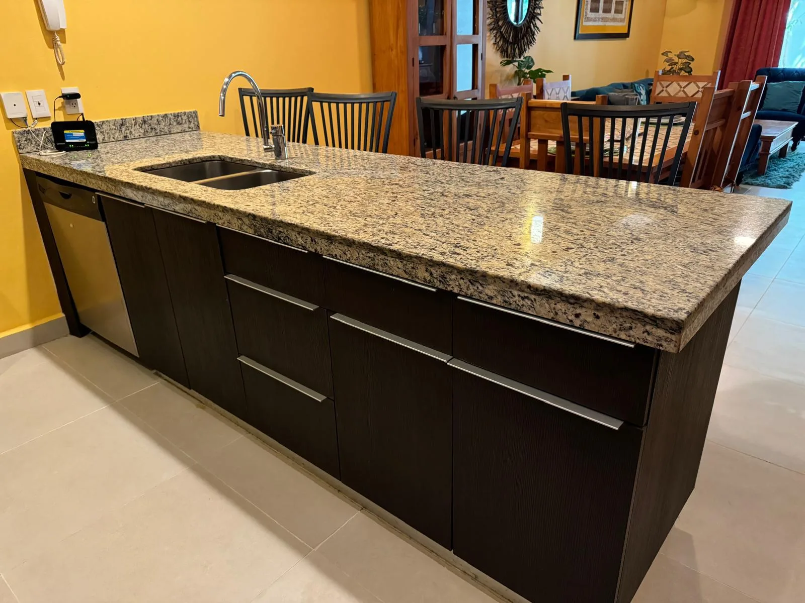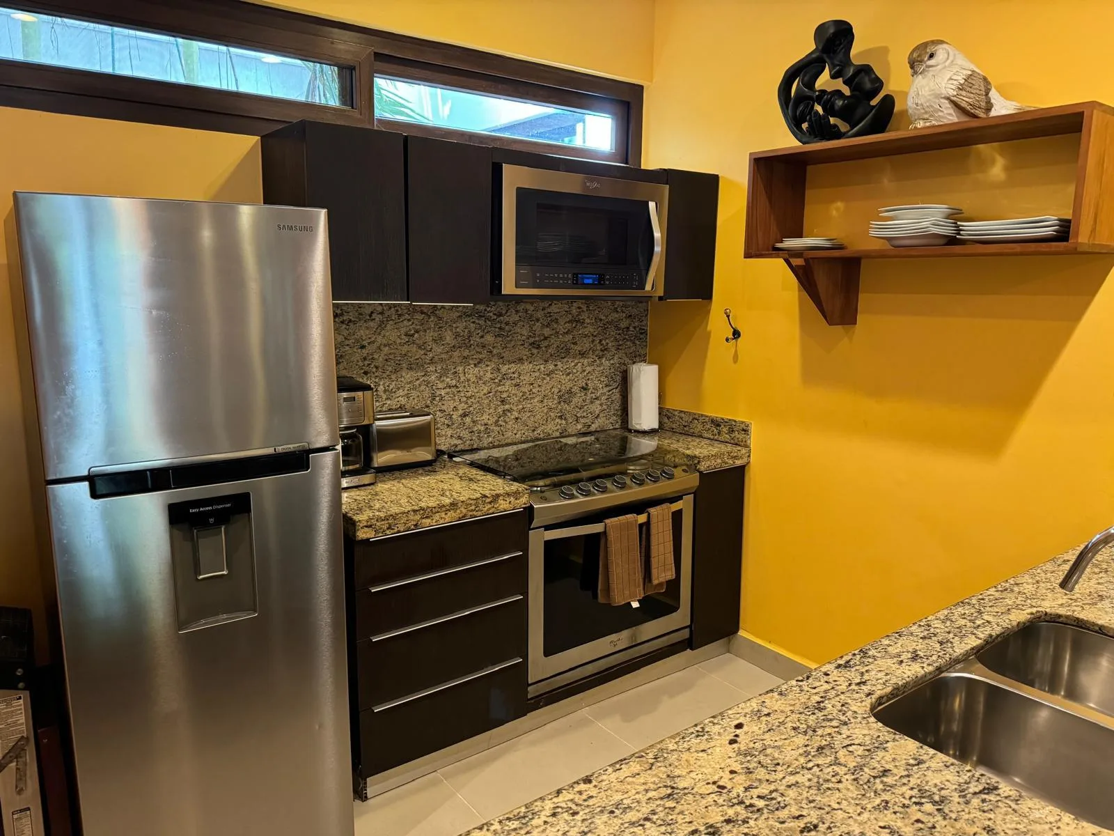 This ground-floor condo in Tao is furnished and ready for immediate occupancy. The spacious, modern residence features 2 bedrooms and 2 fully equipped bathrooms, each with ample closet space. The kitchen is well-appointed with granite countertops, a full-size stove, refrigerator, and dishwasher. A breakfast bar with integrated double sinks and a laundry room with washer and dryer are also included. Doors from the living room terrace open to a large, private terrace area. All living spaces are air-conditioned and equipped with ceiling fans. The condo is conveniently located near the security gate and just steps from the community pool.