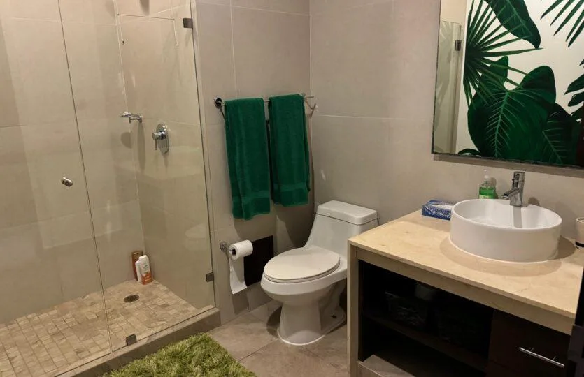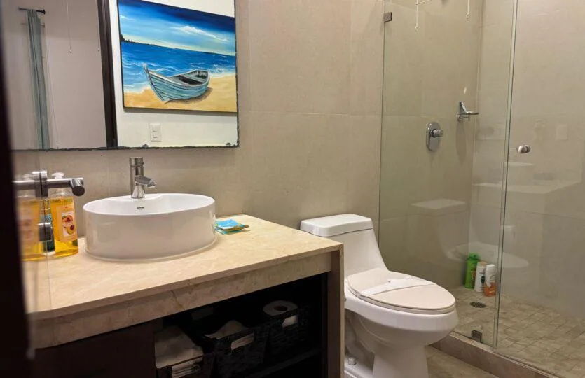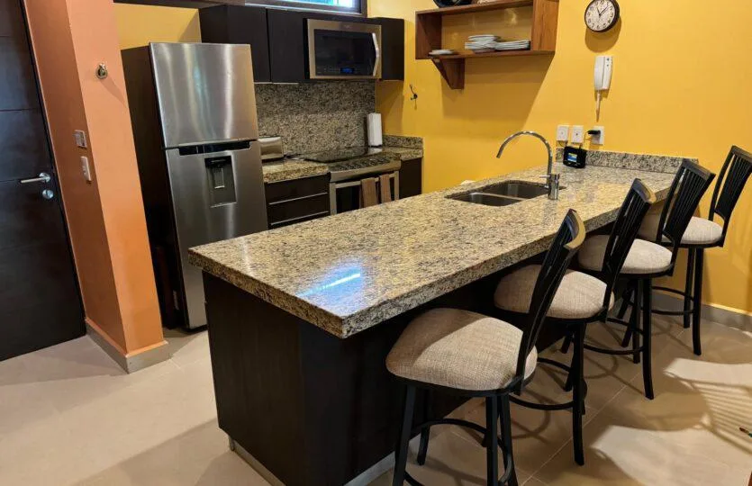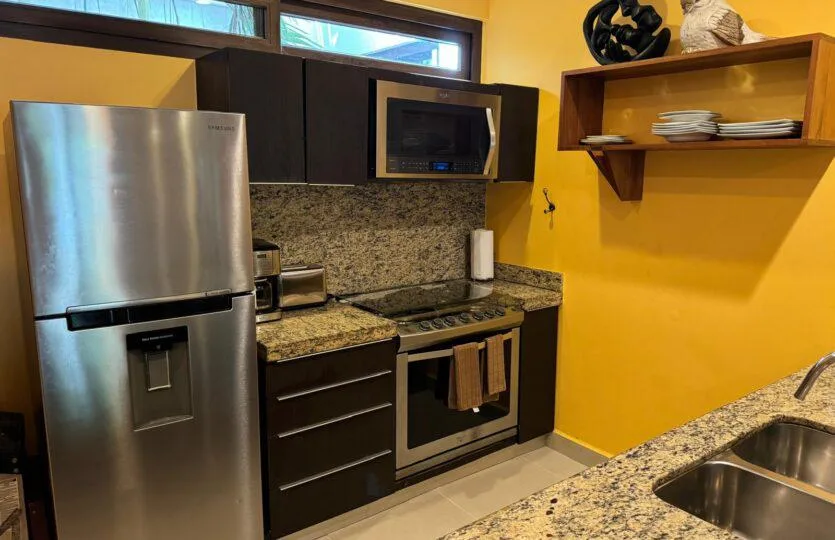 The kitchen is designed for cooking, with granite countertops, a large stove, refrigerator, and dishwasher. The condo also has a large private terrace, ideal for enjoying warm afternoons with the sea breeze or for entertaining guests in a comfortable and exclusive atmosphere.