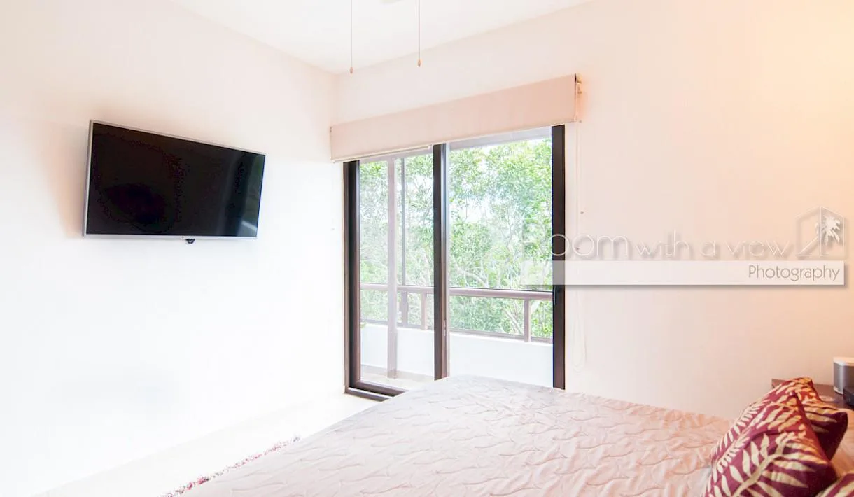 The spacious 2-bedroom penthouse has an open design with ample natural light. It includes a laundry room and a private rooftop terrace with a sunbed area, a Jacuzzi, and views of the jungle and resort. The penthouse is fully furnished and equipped.