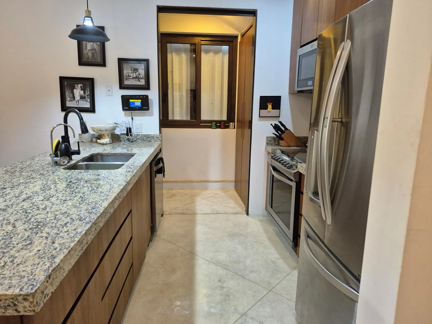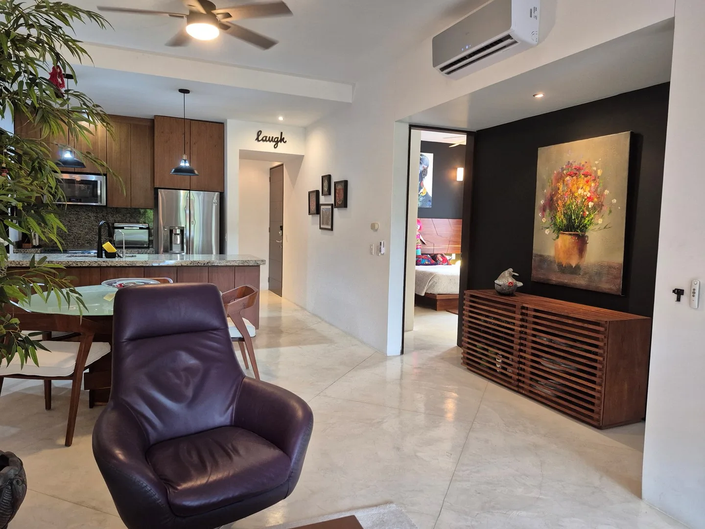 This desirable corner unit enjoys abundant natural light and enhanced privacy, with thoughtful additions including hurricane-rated blinds and front-loading LG washer and dryer. The open-plan living area, adorned with playful art, seamlessly extends to a private terrace, creating a pleasant space for relaxation or outdoor entertaining. The property also includes a terrace with a safety net and a spacious rooftop terrace with storage, ideal for full-time living or vacation rental.