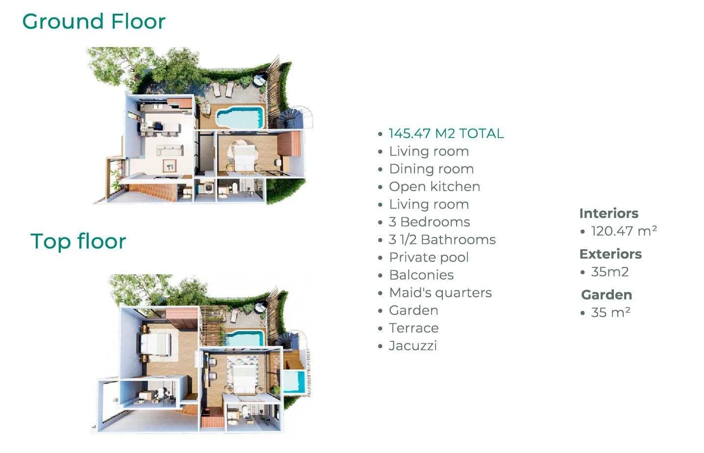 The villa has a private swimming pool, balconies, and a lush garden. It also includes a large terrace and a Jacuzzi. The interior space measures 120. 47 square meters, while the exterior and garden areas each provide 35 square meters.