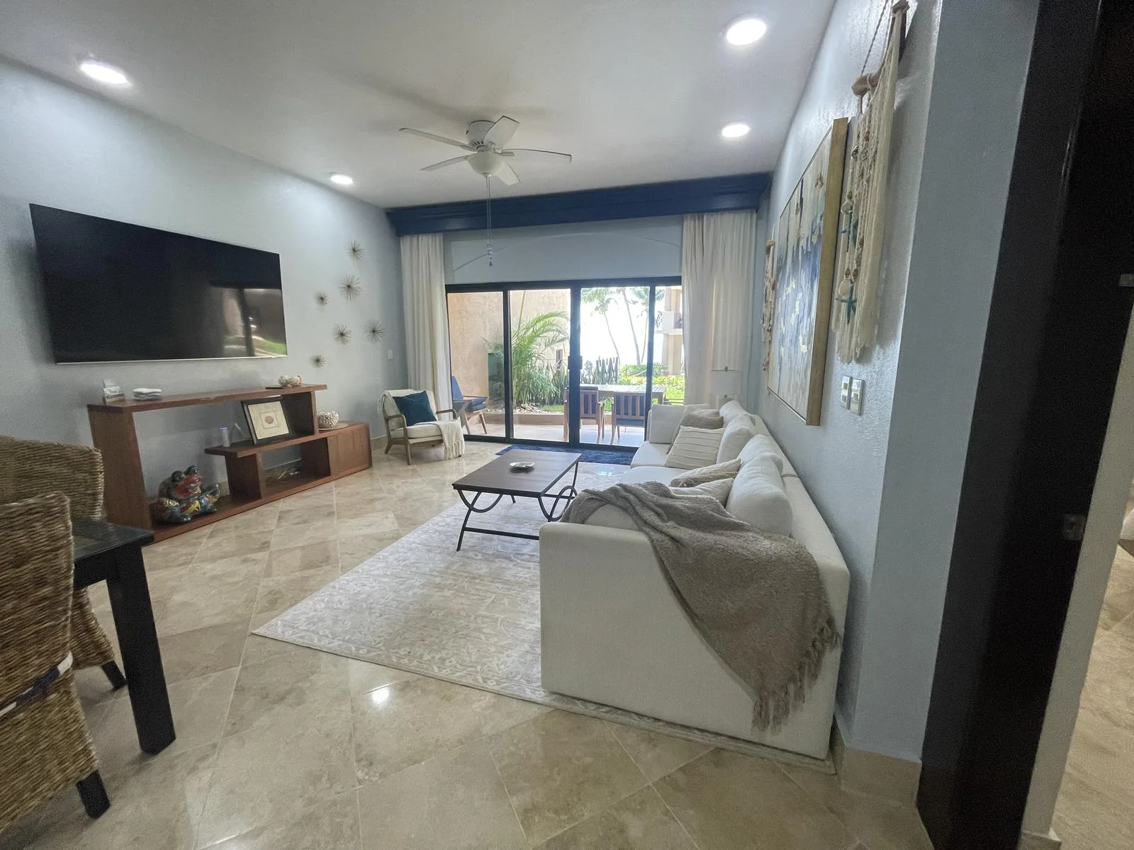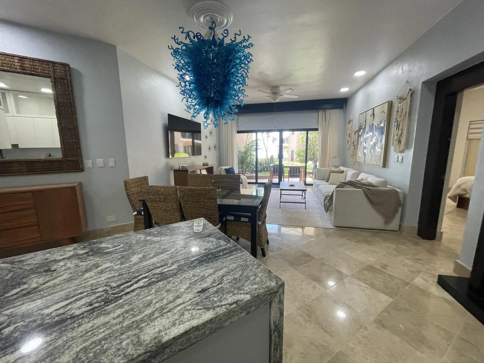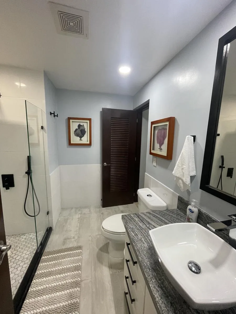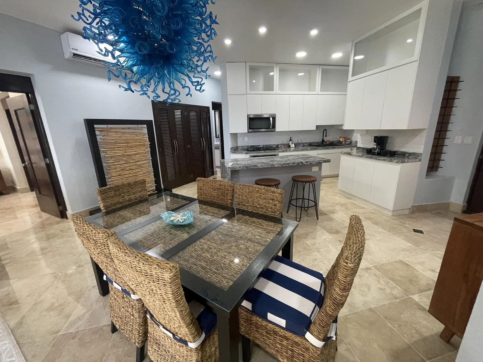 The unit was fully renovated in 2021 with high-end finishes and upgrades designed for luxury, functionality, and durability. Notable features include custom LED lighting, soft-close cabinets and drawers, high-efficiency cyclone-resistant doors and windows, an integrated water softener and instant hot water heater, marble flooring throughout, cyclone-resistant curtains, granite countertops, air conditioning in all areas, and a purified water system connected to the refrigerator for filtered ice. The property also includes a spacious laundry room with an LG washer and dryer, custom curtains, blinds, and frames, and a vanishing glass door in the primary bedroom. The gourmet kitchen features custom cabinets and a five-burner gas stove.