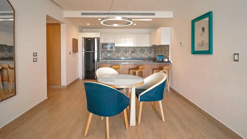 Amenities include a private beach club, five swimming pools with two being infinity pools, 15 restaurants and gourmet corners, nine bars including swim-up and rooftop options, a world-class spa, a gym, sports tracks, a Kids Playhouse, a Teen’s Game Room, a Marley Coffee shop, a shopping plaza, and butler and housekeeping services.