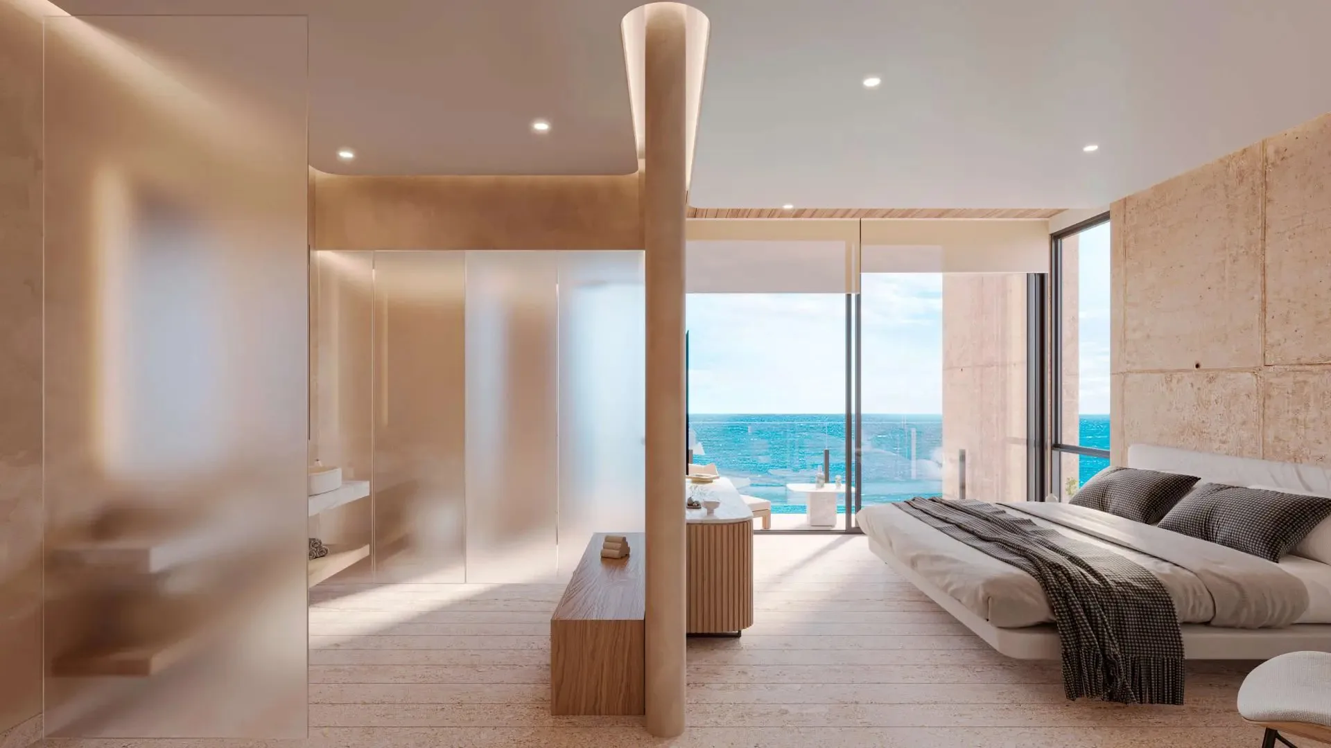 Residents have access to resort-style amenities including a sky bar, infinity beach pool, swimming lane, restaurant, pool cabins, beach cabins, jacuzzi, fire pit, gym, padel court, game room, coworking area, lobby, sports beach cabin, and electric bikes.