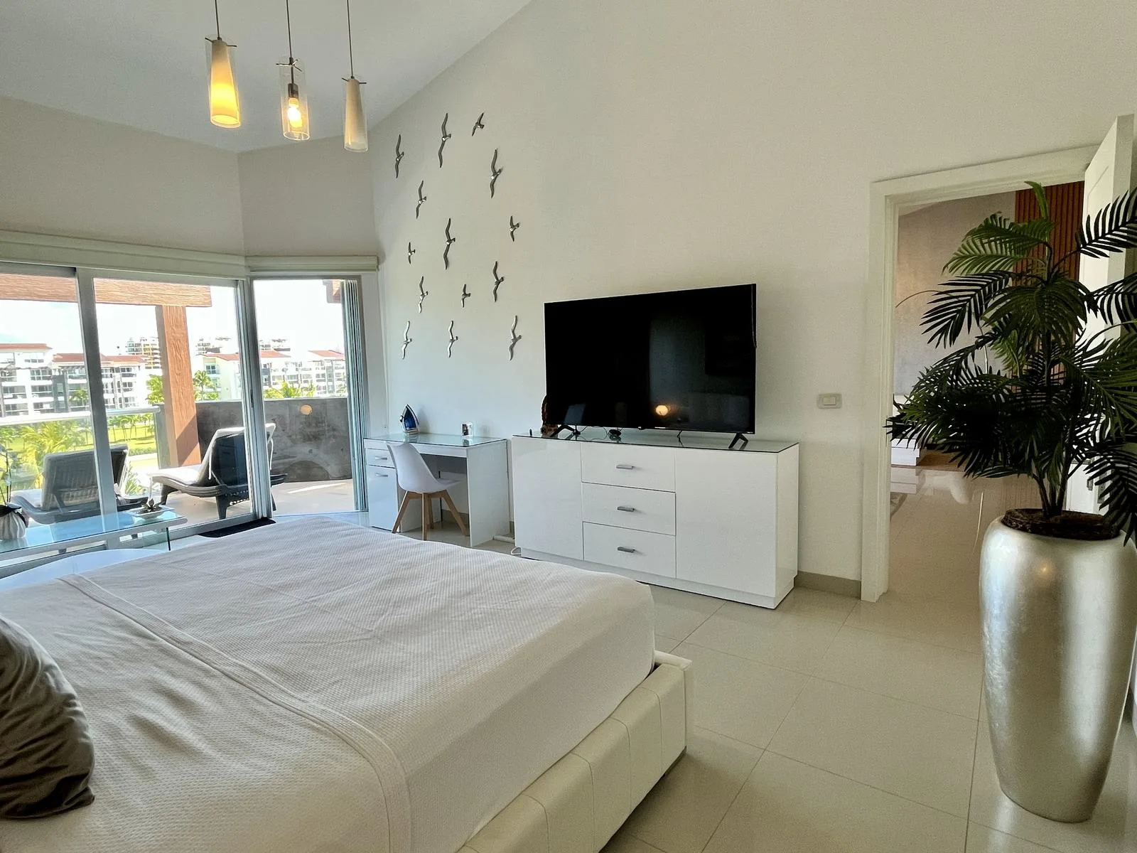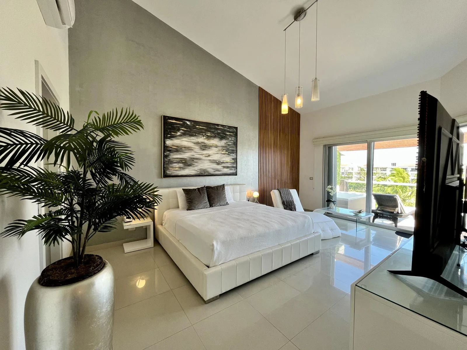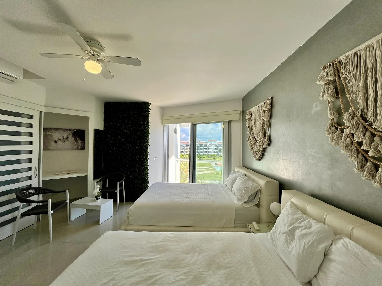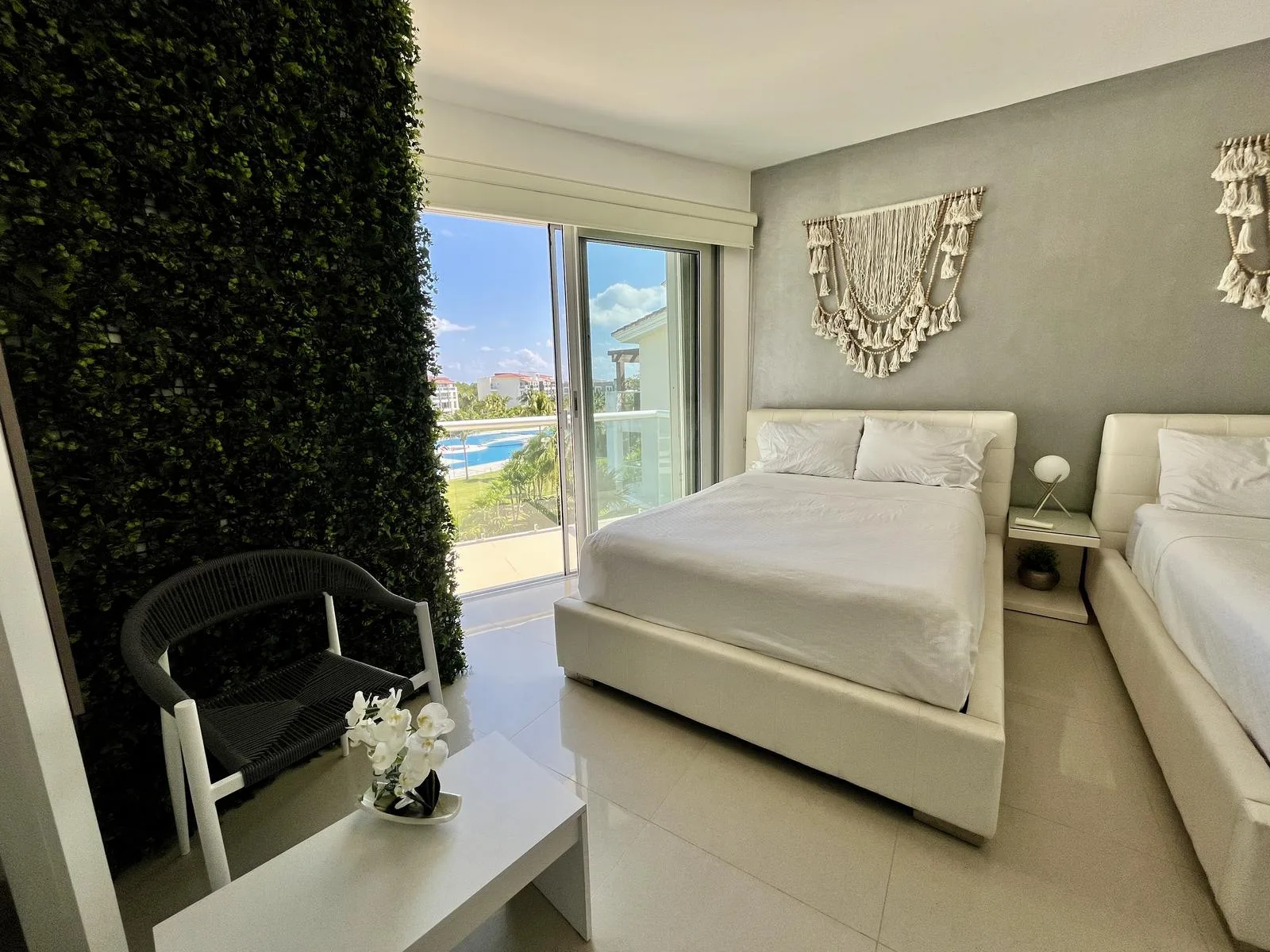 The residence provides direct beach access. On-site amenities include resort-style swimming pools, a fully equipped fitness center, lush green areas, and tropical gardens.