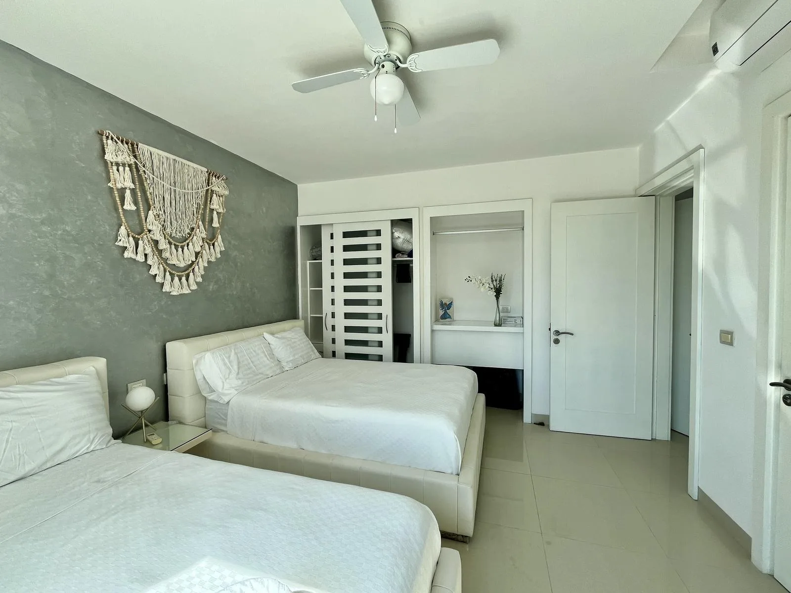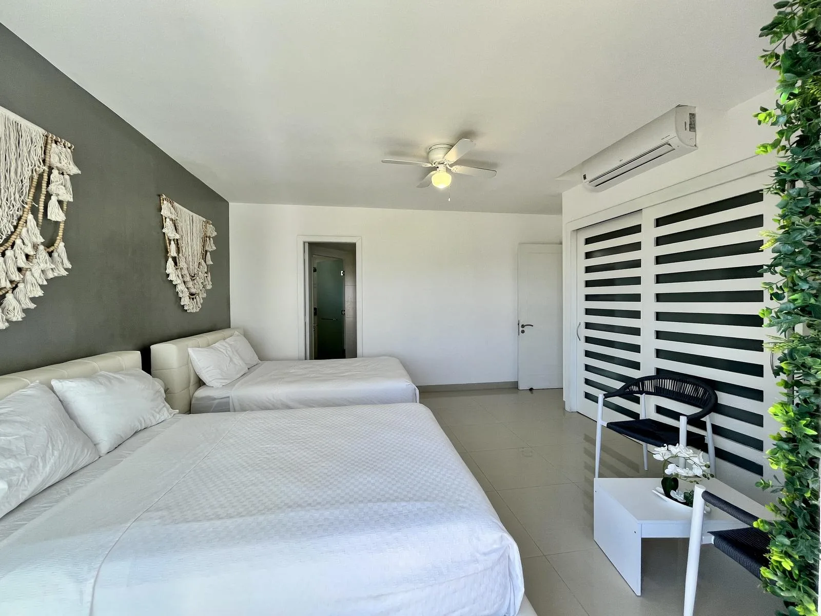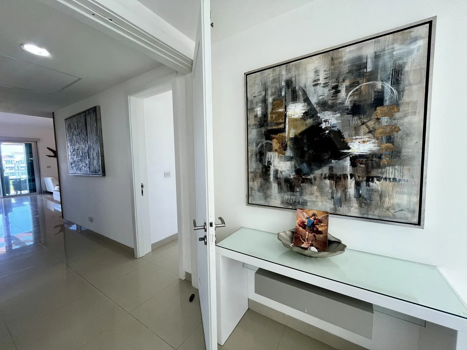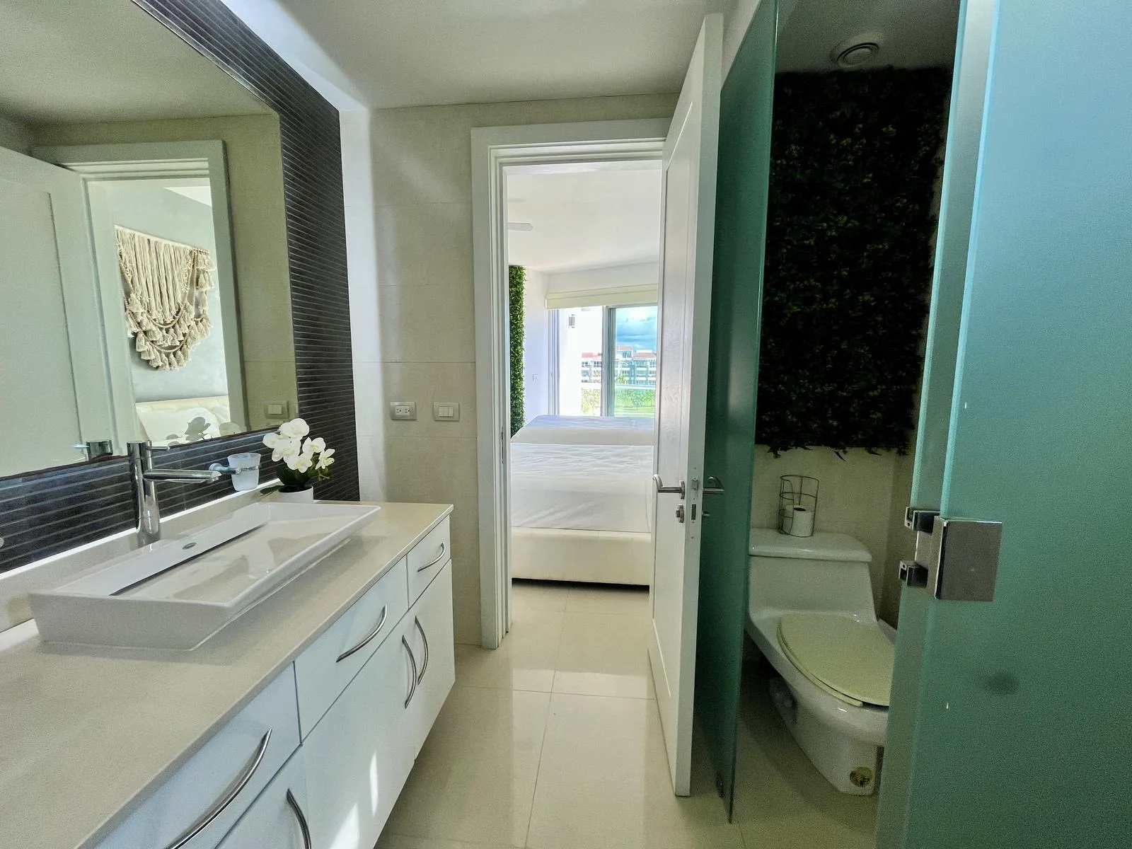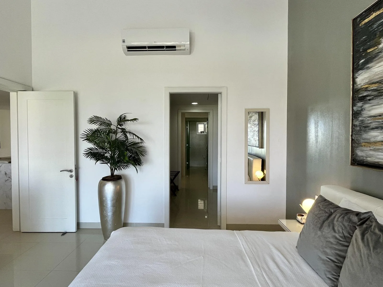 The residence provides direct beach access. On-site amenities include resort-style swimming pools, a fully equipped fitness center, lush green areas, and tropical gardens.