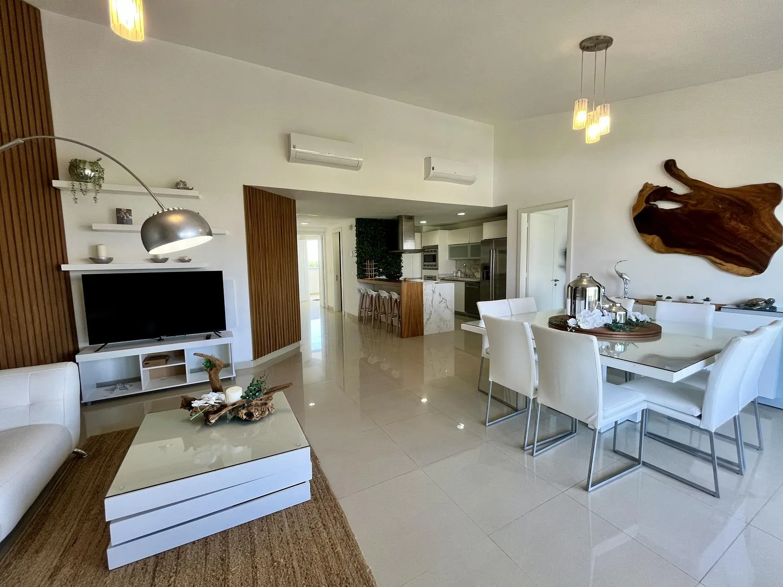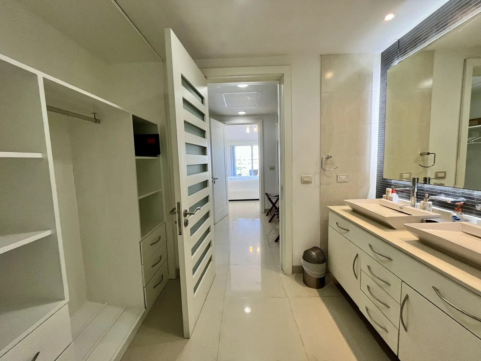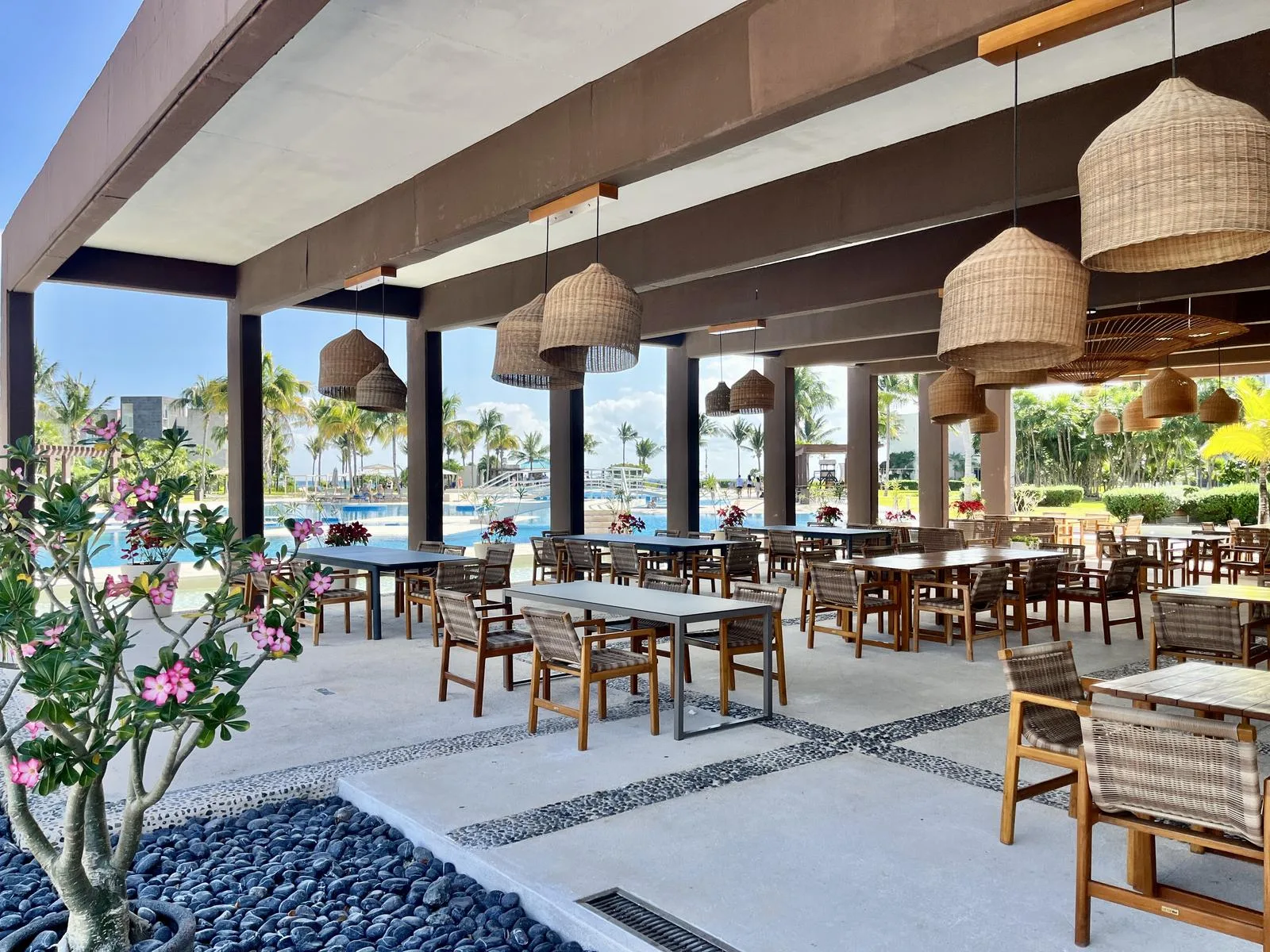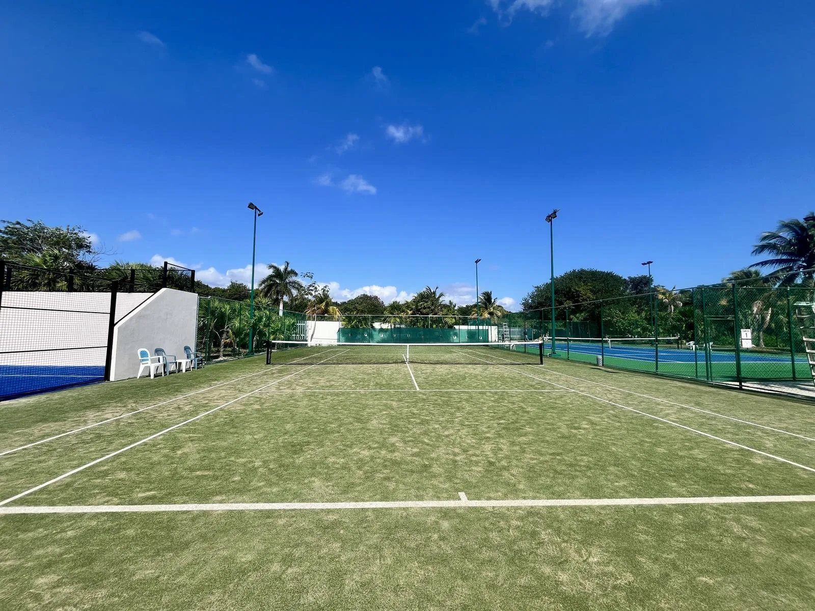 The residence provides direct beach access. On-site amenities include resort-style swimming pools, a fully equipped fitness center, lush green areas, and tropical gardens.