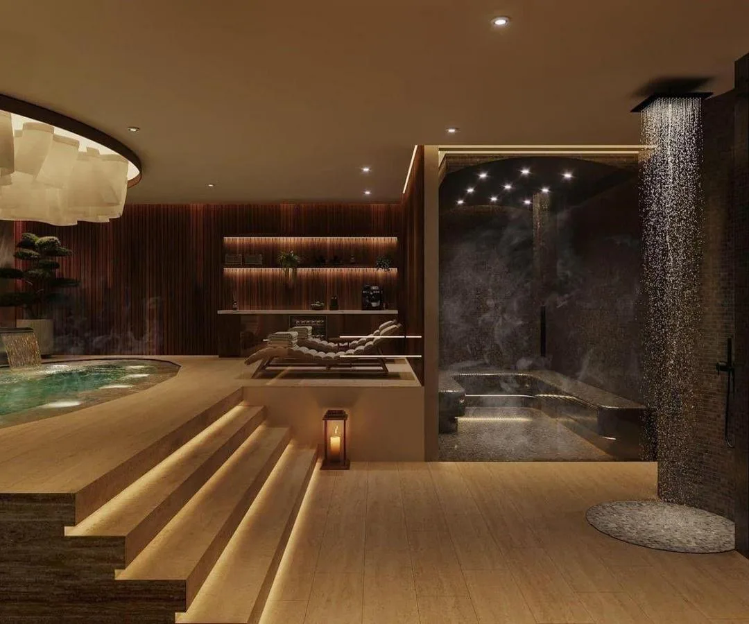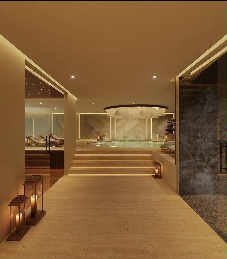 The building includes a rooftop with a swimming pool, jacuzzi, and bar. Additional amenities consist of a spa and lounge area, a fireplace with seating, a coworking space, and concierge service. The property provides private parking, an elevator, and 24/7 security with controlled access.