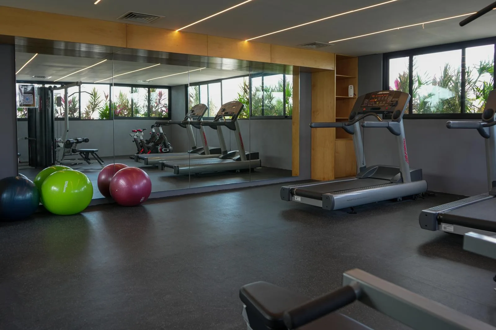The building amenities include a Bar & Grill, two pools, a fully equipped gym, parking for residents and visitors, a coworking area, a lobby with reception, and an integrated commercial area.