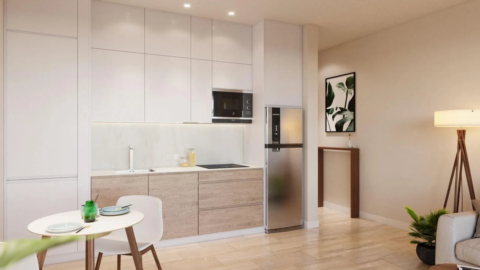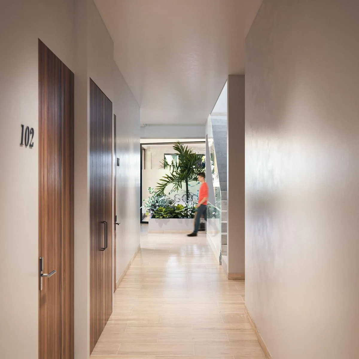 This building comprises 46 one-bedroom units, with only eight apartments per floor, ensuring a private and calm environment.