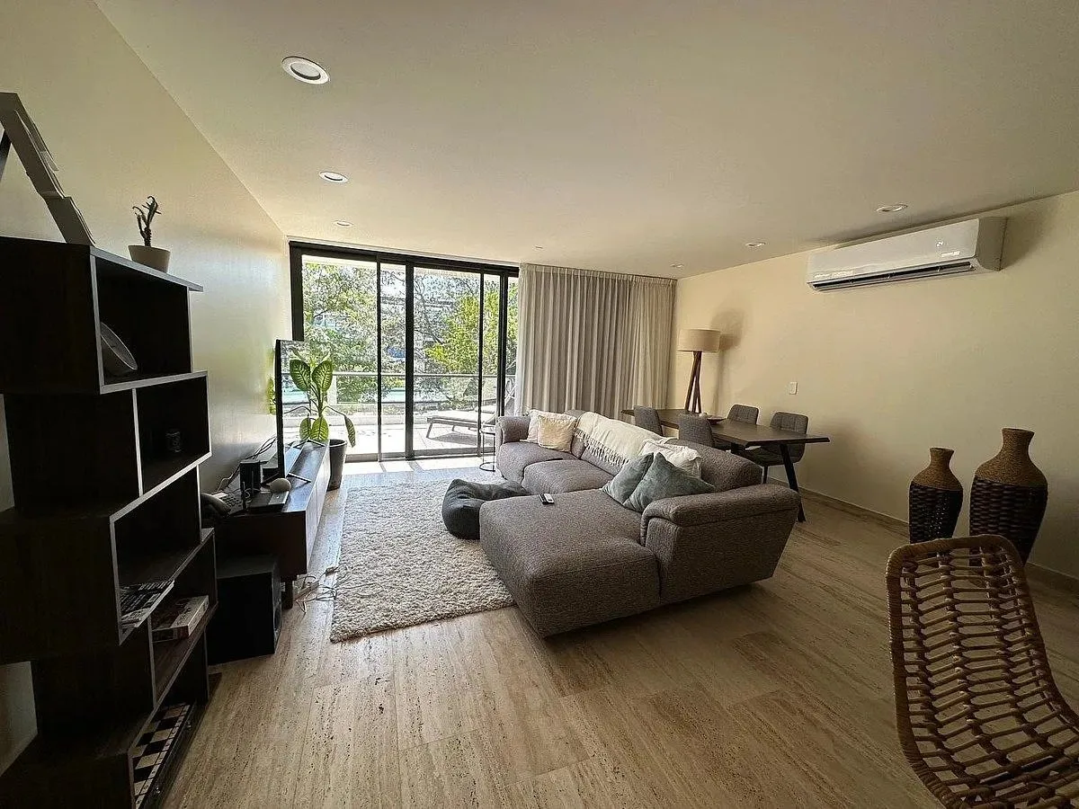 The apartment includes a laundry area and linens. The project features resort-style amenities and access to a beach club, situated in the Playacar residential area of Playa del Carmen.