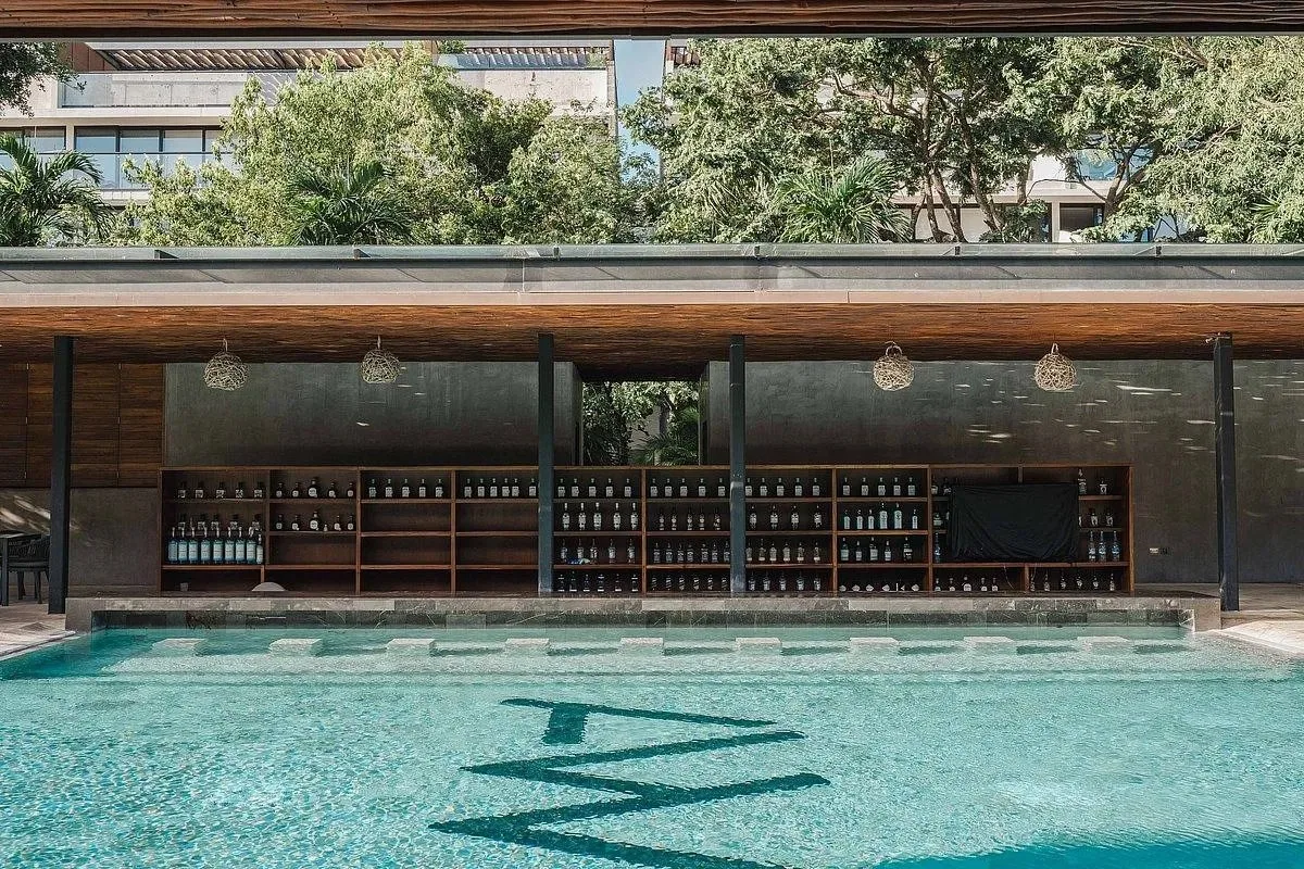The building offers a comprehensive selection of amenities including a rooftop infinity pool, a linear pool over 100 meters long, jacuzzis, a kids club, cabanas and lounges, a bar, a yoga place, a zen garden, a gym, a paddle court, a meeting room, a billiards area, a beach club, 24/7 security, and an elevator.