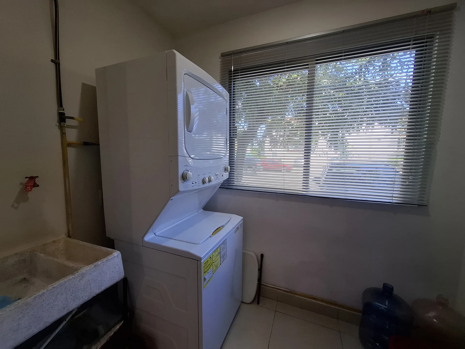 The kitchen is roomy and functional and includes a separate laundry area. The apartment is fully furnished and equipped.