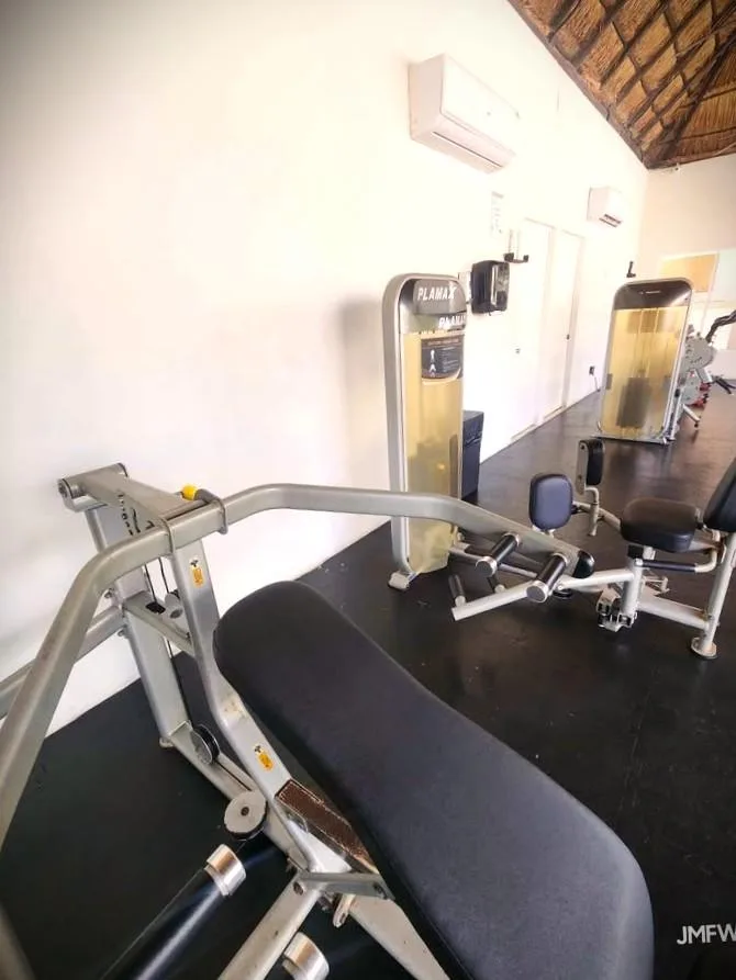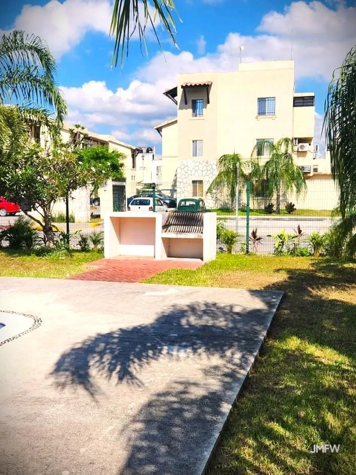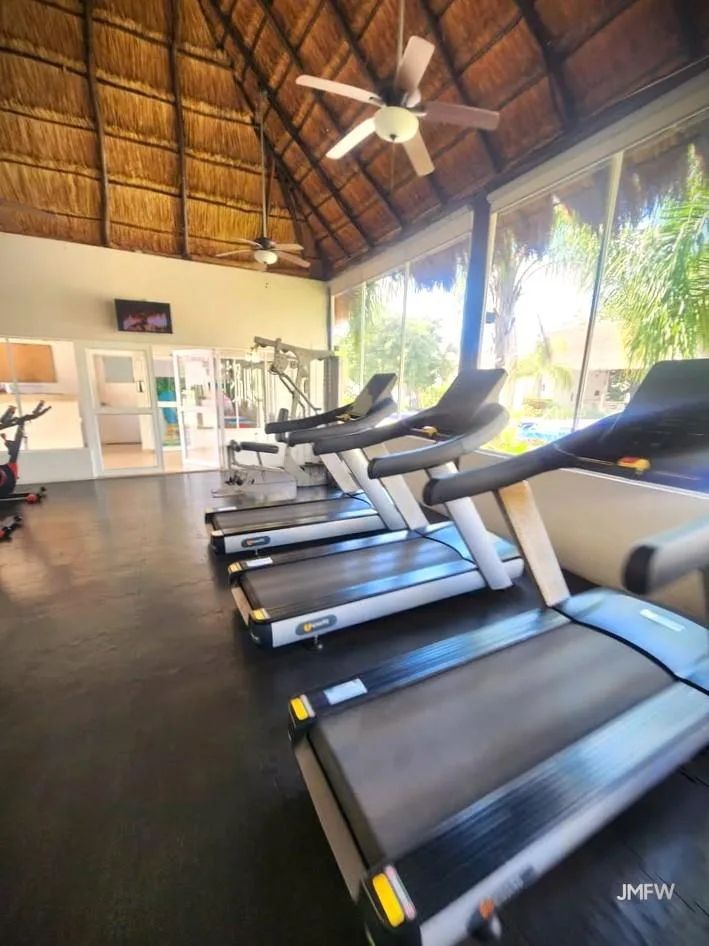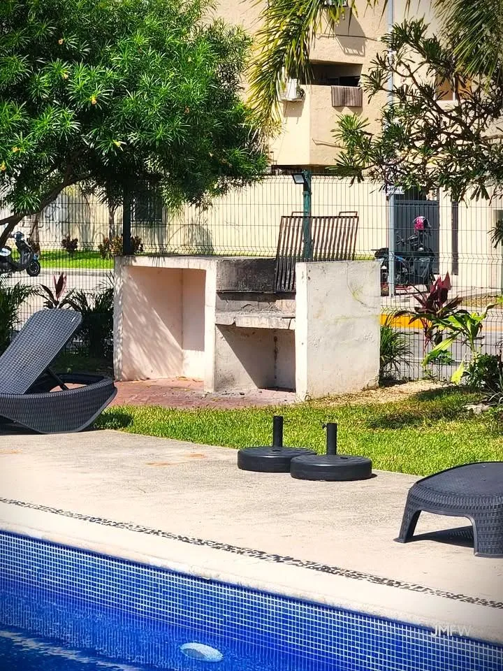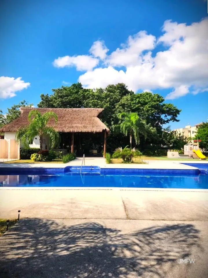 The building complex includes a swimming pool, landscaped green areas, a children's playground, and a covered palapa structure for gatherings. Additional amenities consist of a gymnasium and a playroom or game room.
