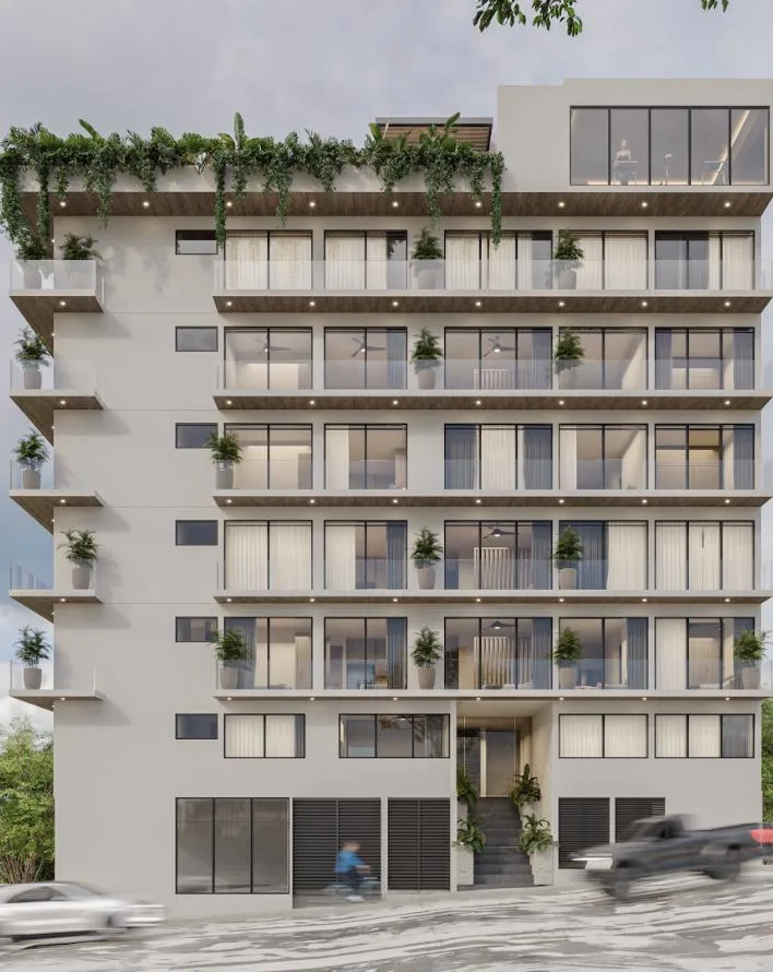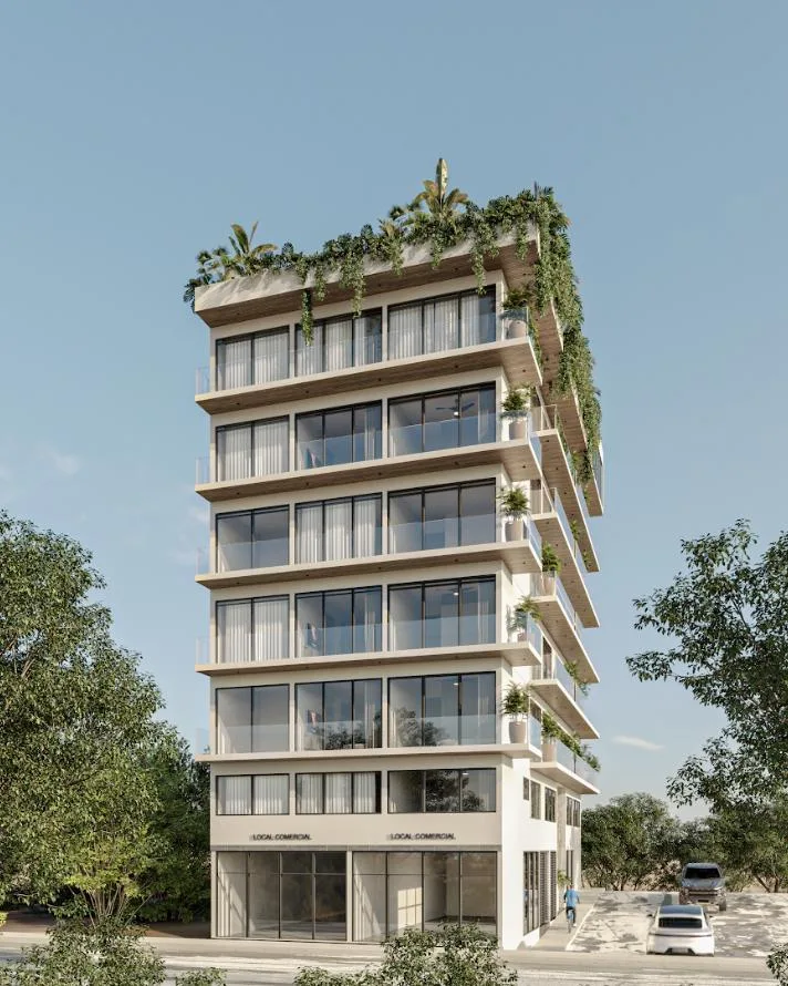 The building features a rooftop infinity pool with ocean views and direct beach access. Additional amenities include a gym, an elevator, a lobby, and security. The property also offers sunbeds, laundry facilities, and commercial spaces.