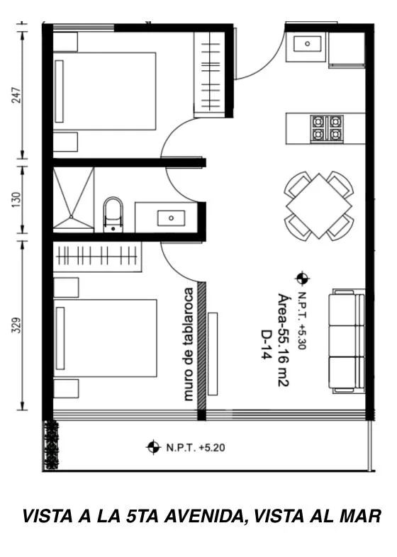 This 55 square meter apartment features two bedrooms. It is situated approximately 350 meters from the beach and offers views of the Caribbean Sea. The property is set within a protected natural environment of mangroves.