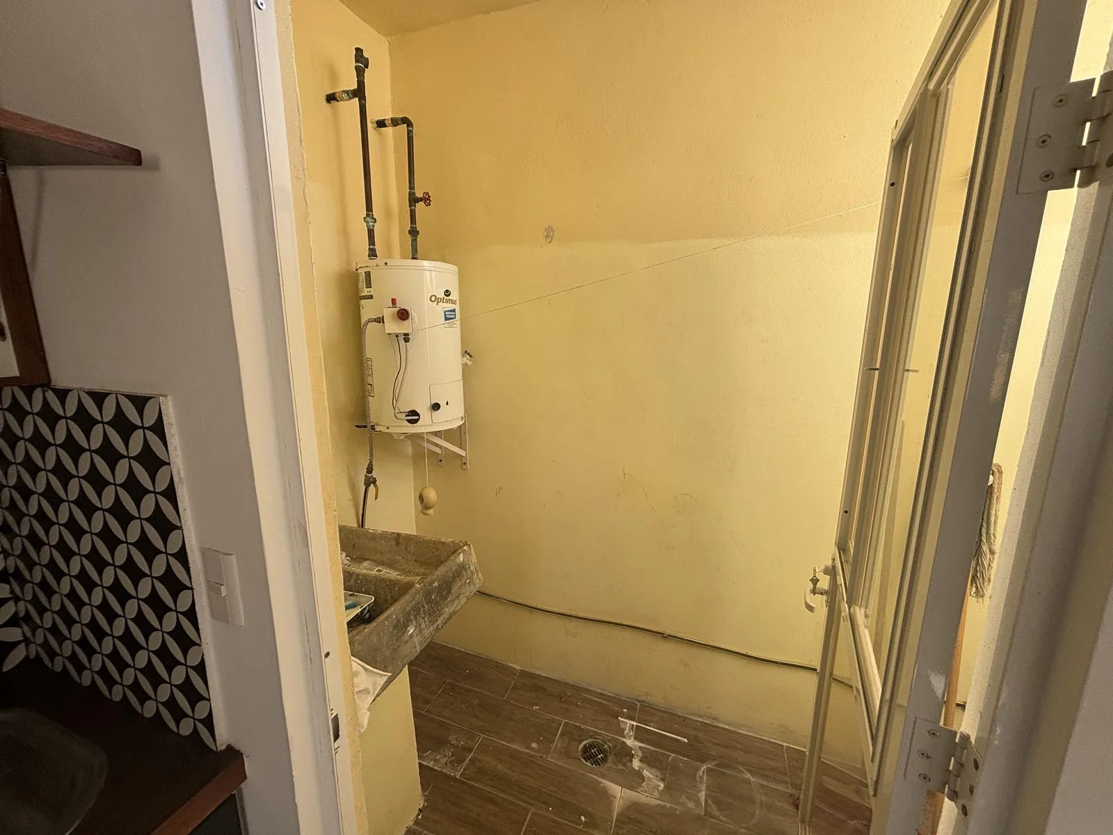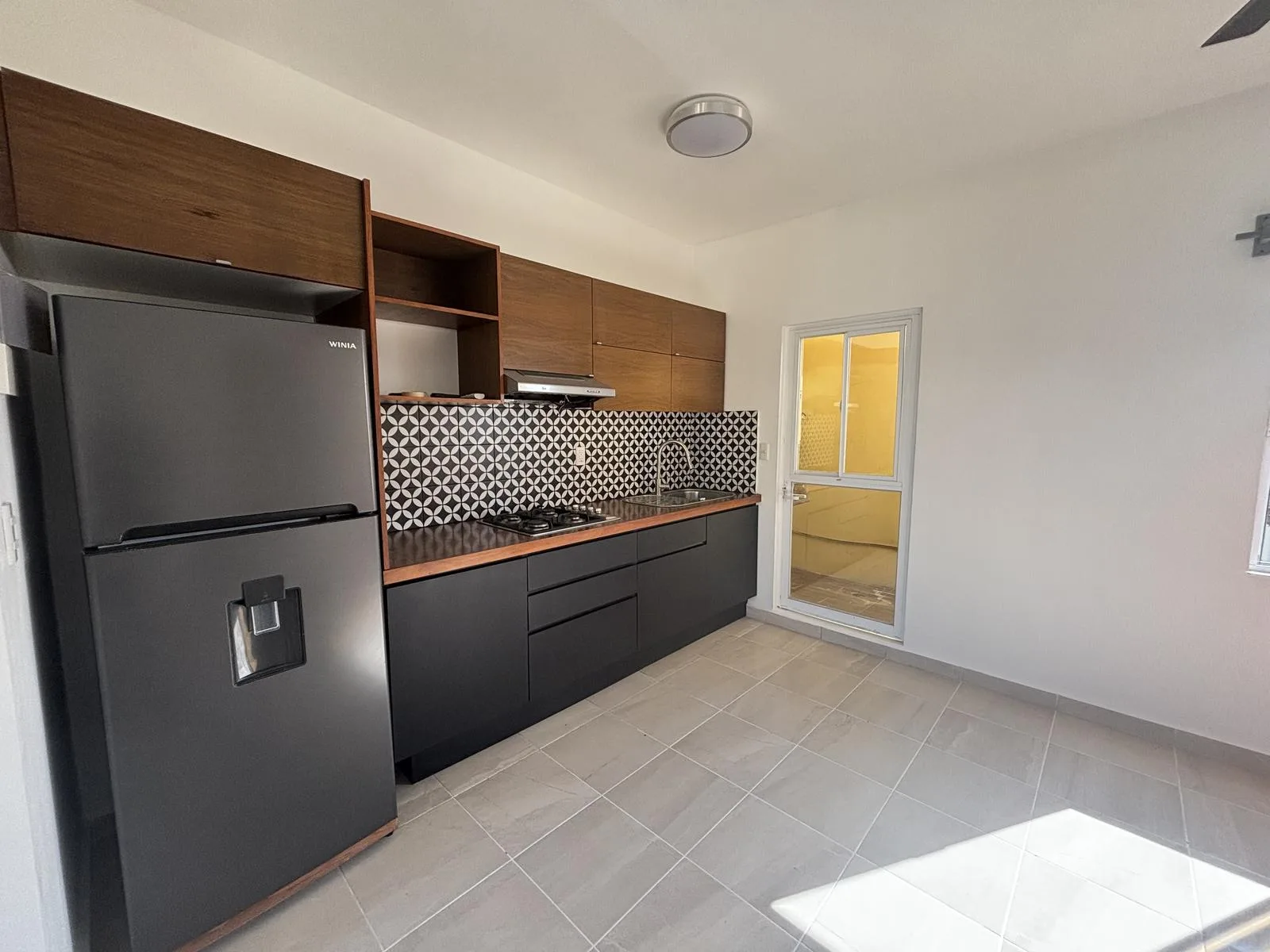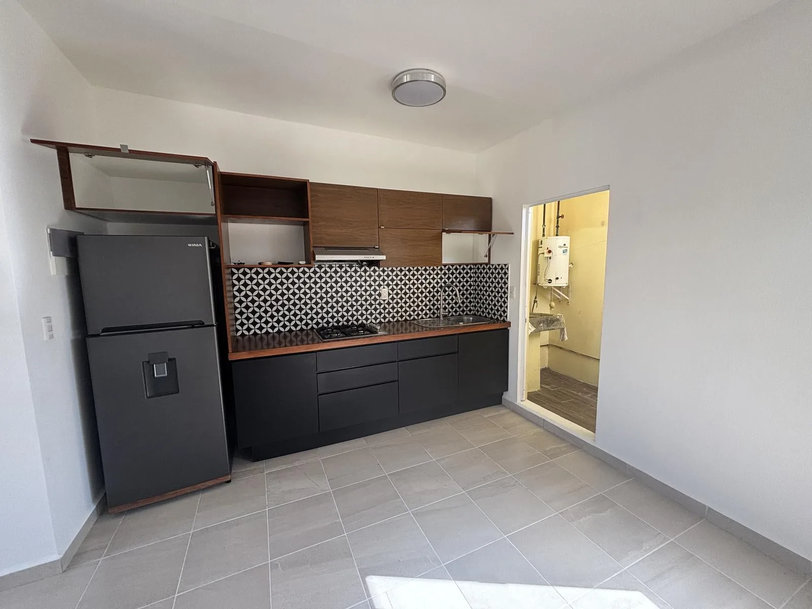 The integrated kitchen is equipped with a gas stove and refrigerator. A service patio with a boiler is provided, suitable for a laundry area.
