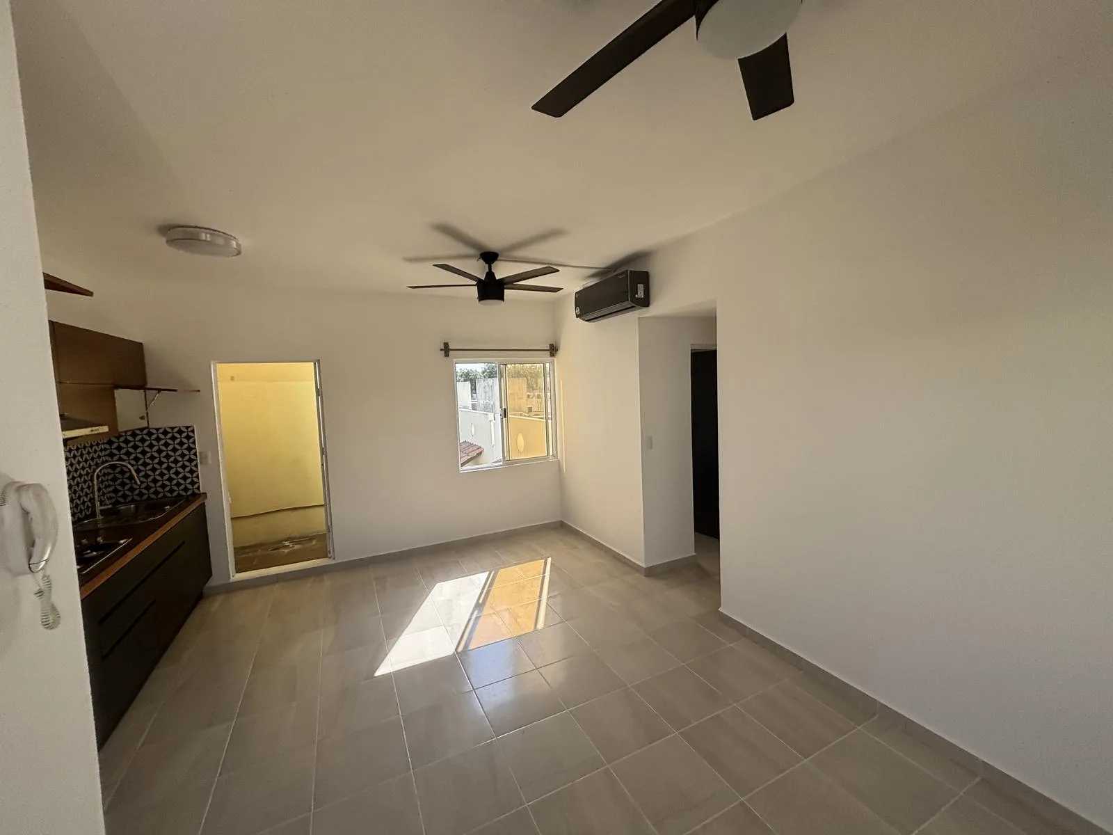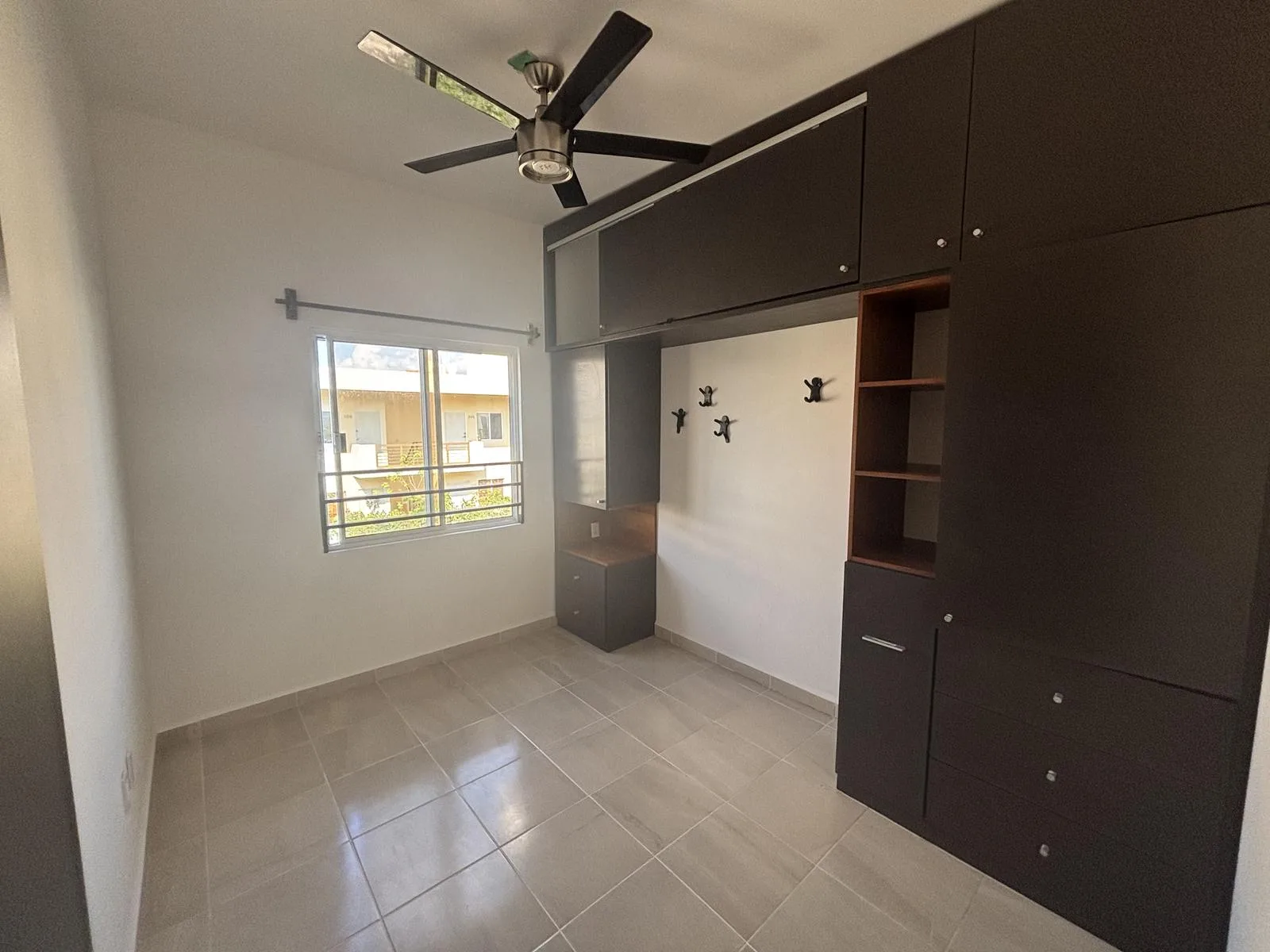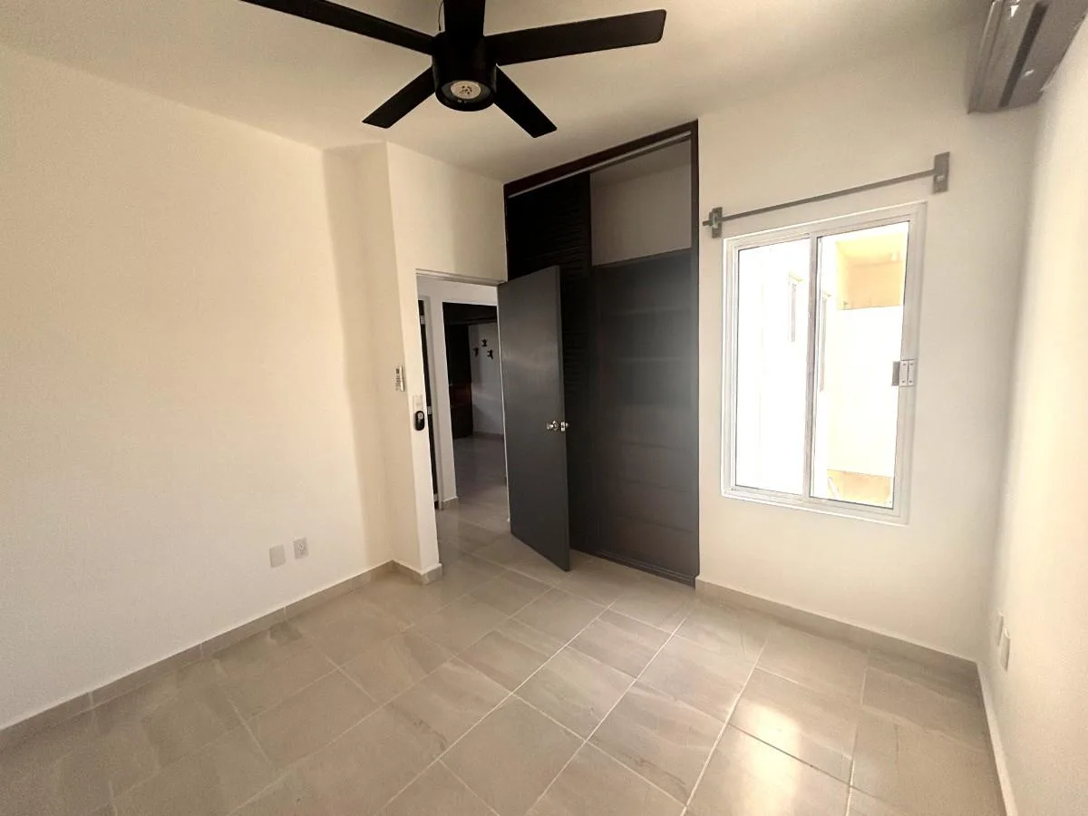 This apartment is located in Jardines de Mayakoba, Playa del Carmen. It features three bedrooms and one full bathroom. All bedrooms include closets and ceiling fans. There are two air conditioning units in the bedrooms and one in the living room.